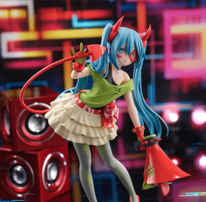 Bring the noise! Sega is proud to introduce a new entry in the FiGURiZM line: the pop sensation Hatsune Miku dressed in her DE:MONSTAR T.R. outfit! Equipped with a louder-than-life microphone and grabbing her devil's tail, this superstar is ready to rock! (Unopened, Box Damaged)