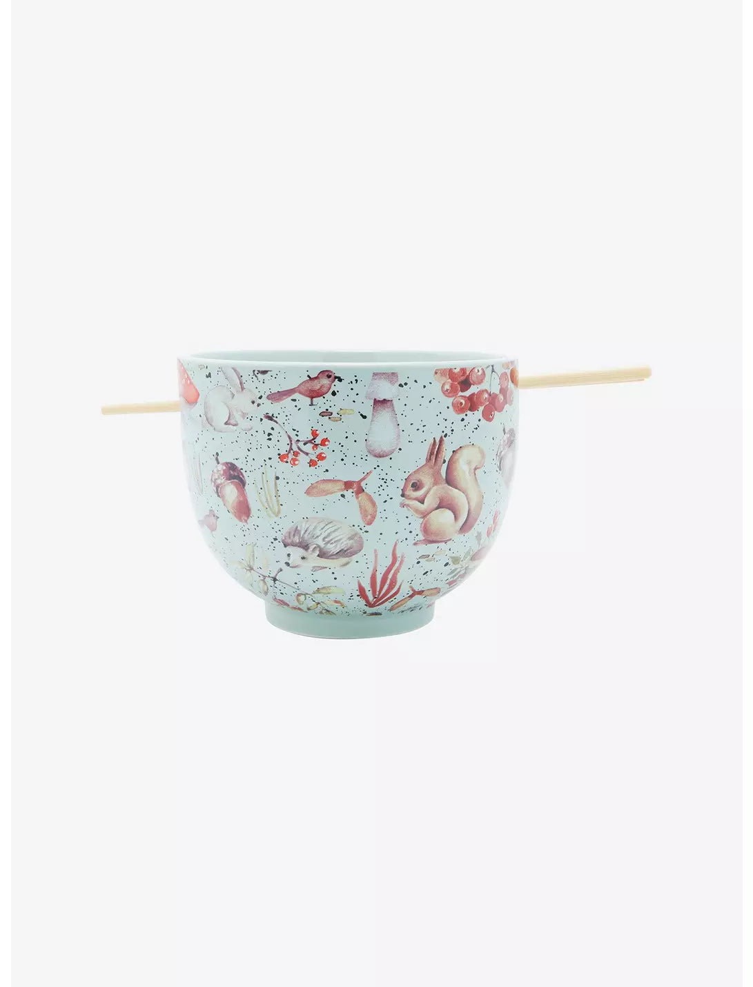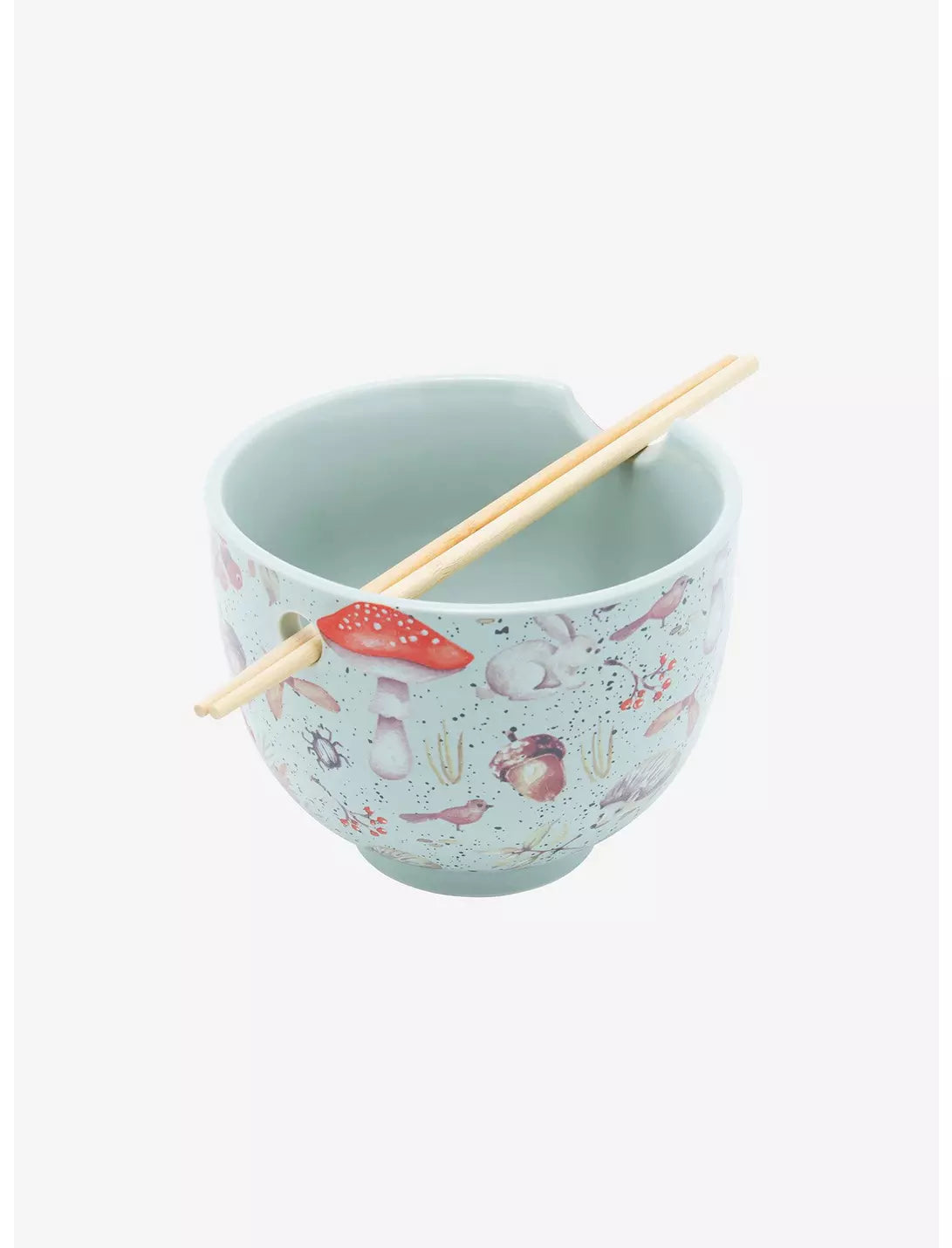 Bring the forest with you while enjoying some ramen at home! This cottagecore ramen bowl features an allover print of forest flora and fauna. Comes with a set of chopsticks and a notch to set them on.