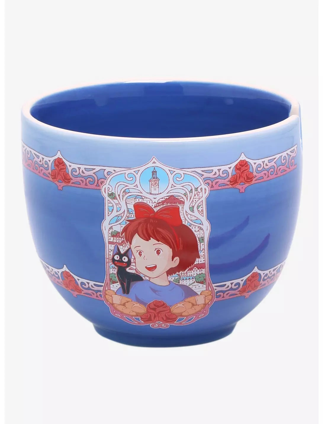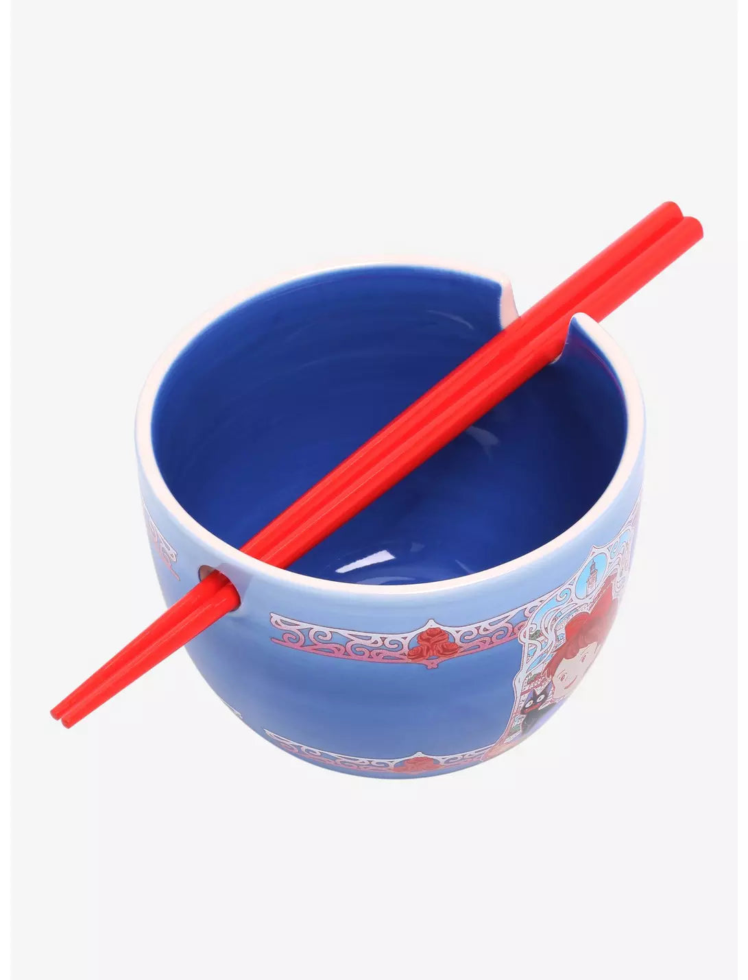 Take a break from deliveries with this Kiki and Jiji ramen bowl! This bowl features a portrait of Kiki and Jiji with an ornate frame design wrapping around the bowl. Also features a built-in hole and rest for the included chopsticks.