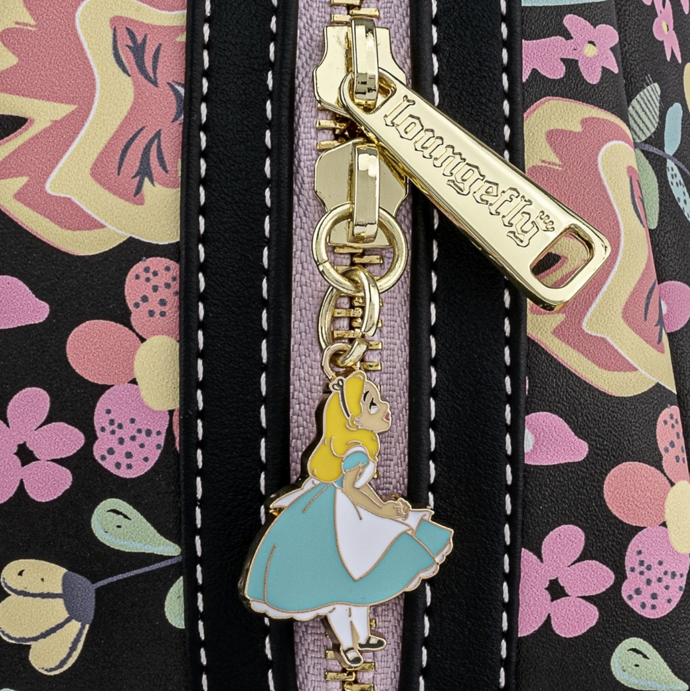 Bring color to your day with this beautiful Alice in Wonderland Flower print bag! This backpack is a fully covered AOP including the inside lining adorned with a cute Alice enamel pin for the zipper.