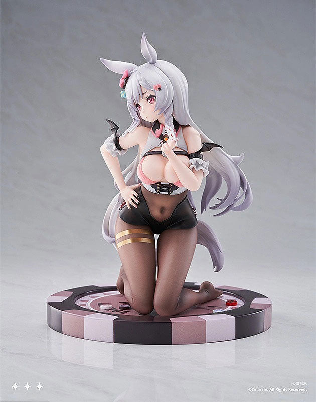 Kurima's original character Ashige-chan has been transformed into a scale figure in a card dealer outfit! Her confused expression unfamiliar with the casino atmosphere, silky hair draped over her shoulders and toes stiffened up so as to feign confidence, every detail has been faithfully captured in figure form.