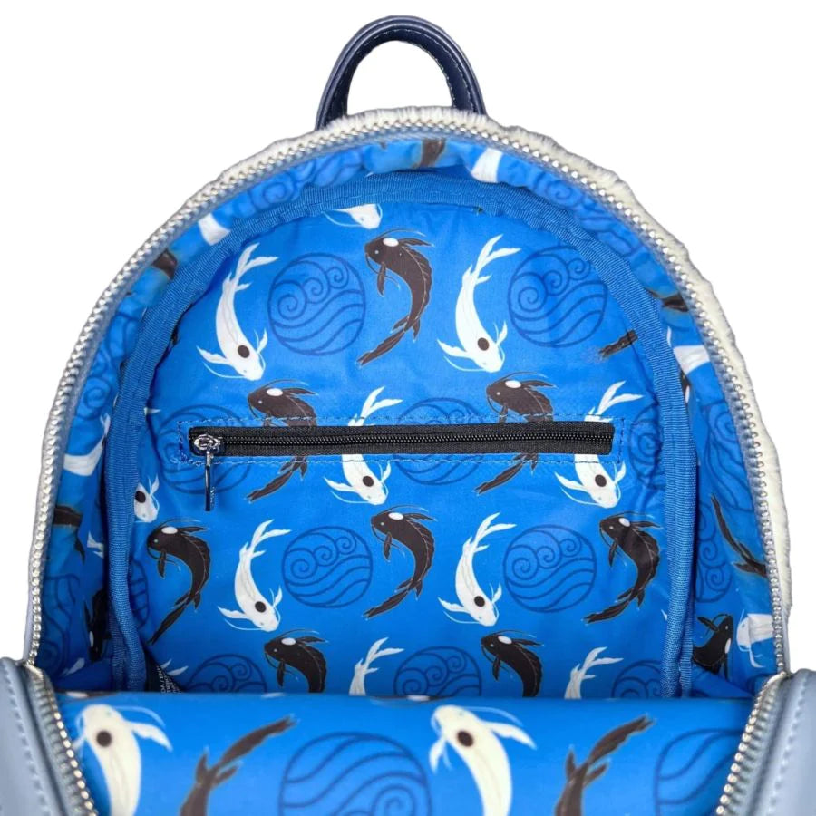 The Water Tribe, versed in the power of waterbending, are clearly represented as this cosplay style design. Like their blue anoraks, this accessory is trimmed with soft white faux fur. Shades of blue as well as applique and printed details recreate the anorak while their waterbending symbol appears as both an enamel zipper charm on the front and a debossed logo on the back. Recalling their ancentral origins, the look is completed with the Moon and Ocean Spirits as koi fish on one of the side pockets.