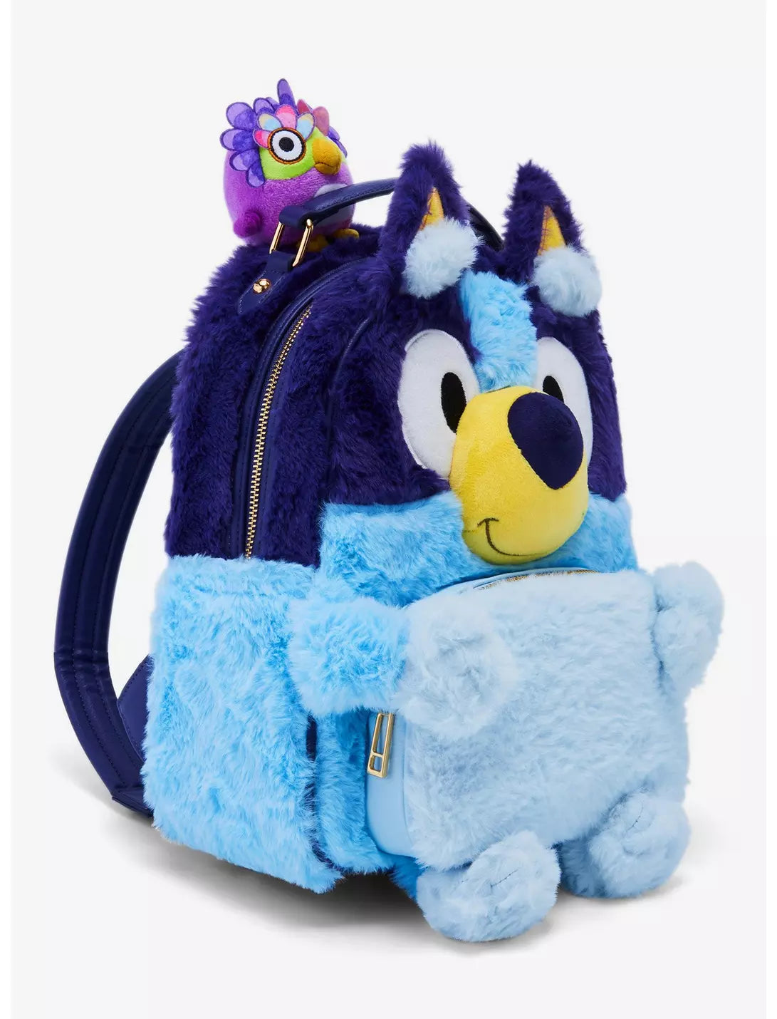 Pack up for playtime with this Bluey mini backpack! Shaped like the adorable pup, this bag features a faux fur body, plush arms and legs, and embroidered details. With a plush Chattermax sitting on top, this bag is perfect for fans of the cartoon.