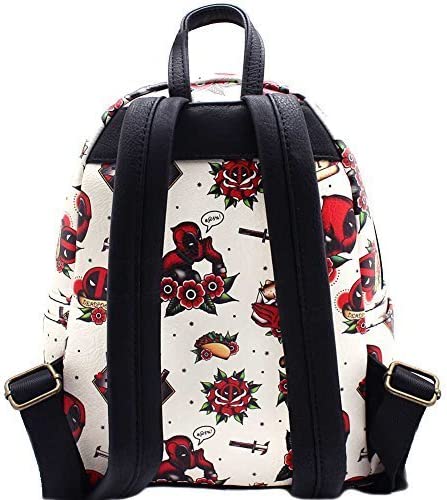 This Loungefly Marvel Deadpool Tattoo mini backpack creates an American Traditional style with the help of Marvel's superhero, Deadpool! All his favorite items and poses are featured all over this faux leather backpack.