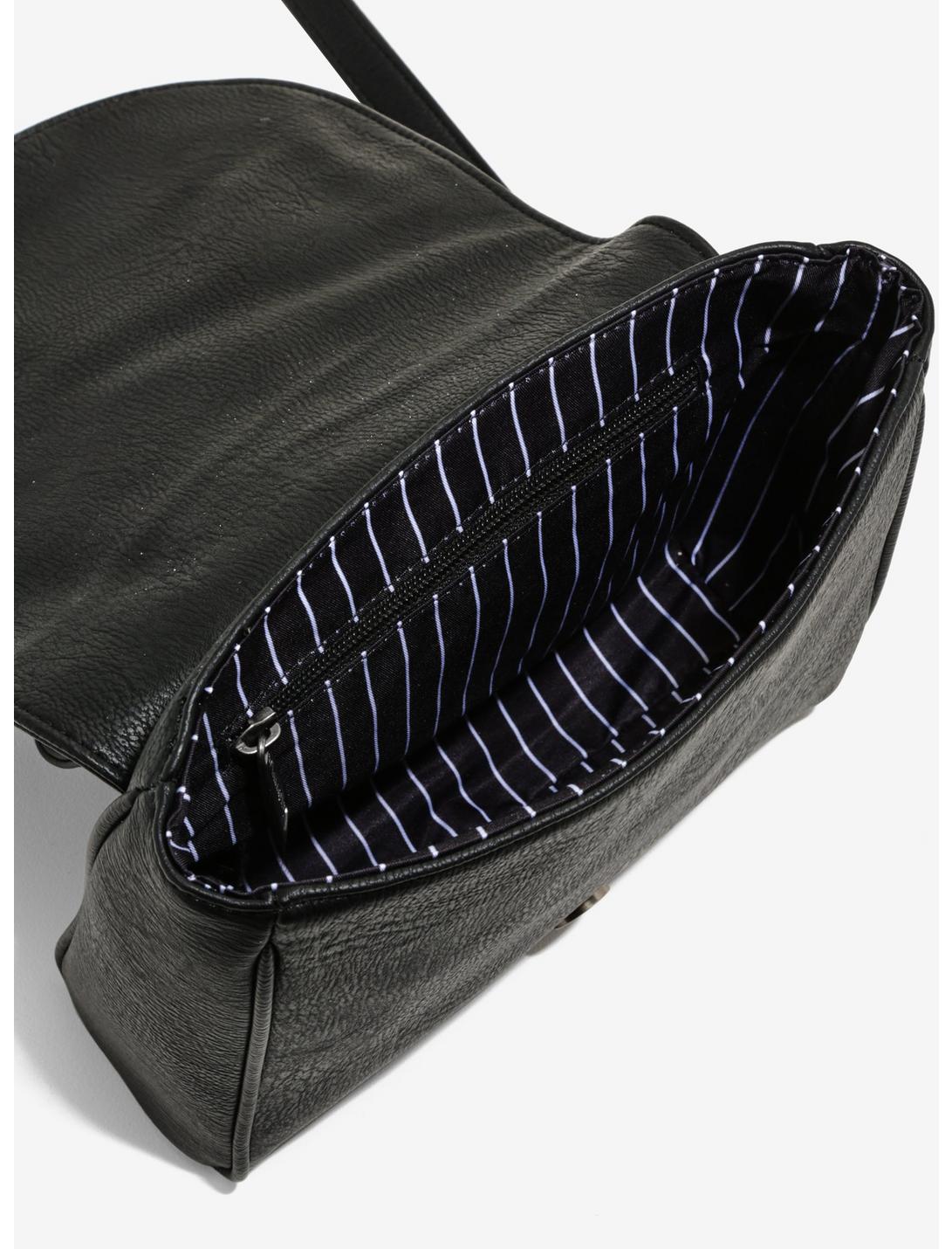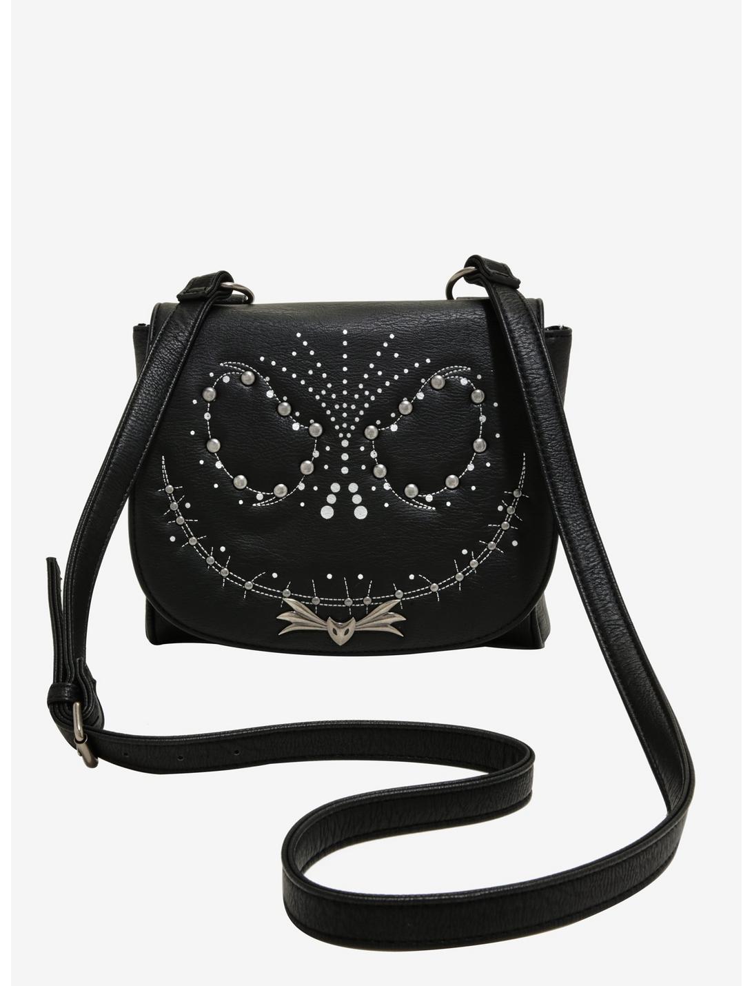 This bag was inspired by The Nightmare Before Christmas and Jack Skellington's spooky, smiling face. With a printed and studded design, this bag features a magnetic closure, internal zipper pocket and adjustable crossbody strap.