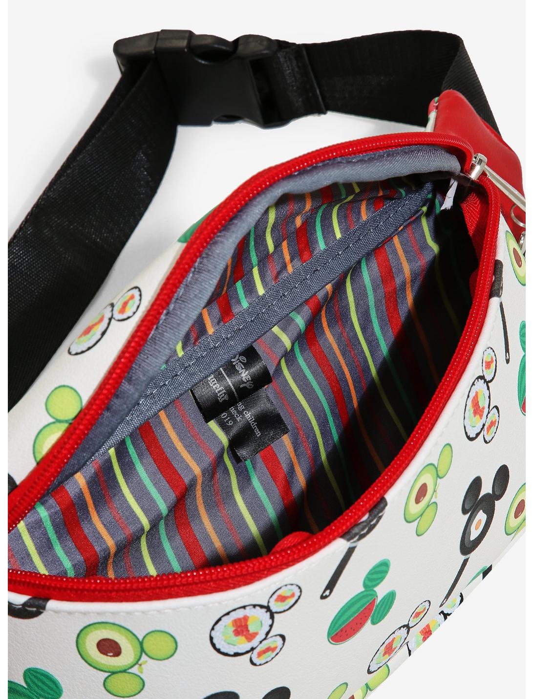 Oh, boy! What a feast! This Loungefly fanny pack and card holder set is sure to satisfy any Disney fan's appetite. The fanny pack features an allover print of food-centric Mickey heads, silver tone hardware, a Mickey charm, and an adjustable waist strap with a buckleclip closure.