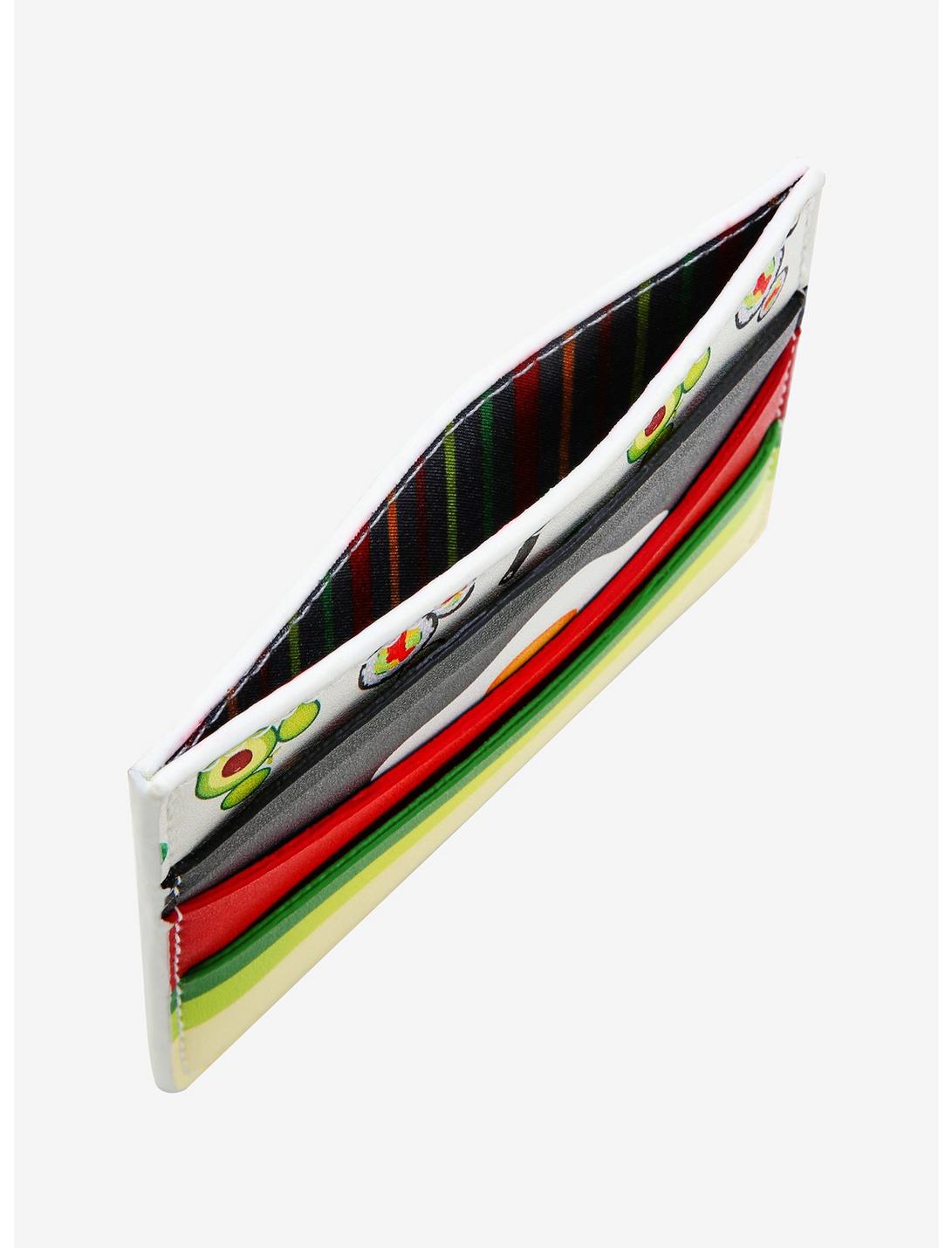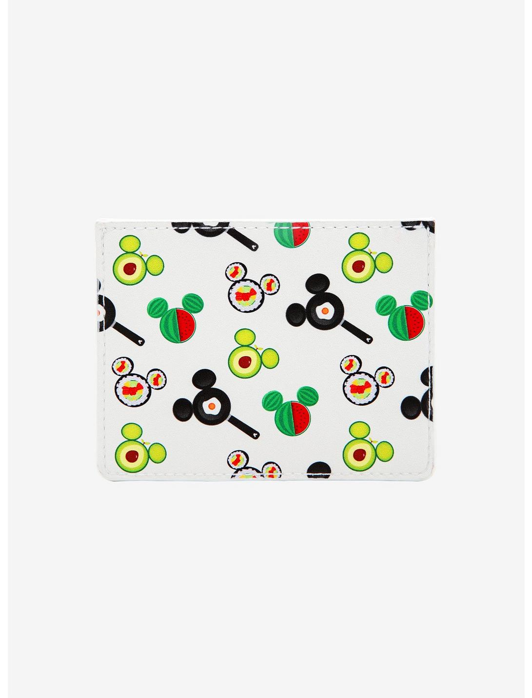 The card holder gives us the best of both worlds! Includes 4 card slots and an allover design featuring Mickey-shaped egg skillets, sushi, avocados, and watermelon.