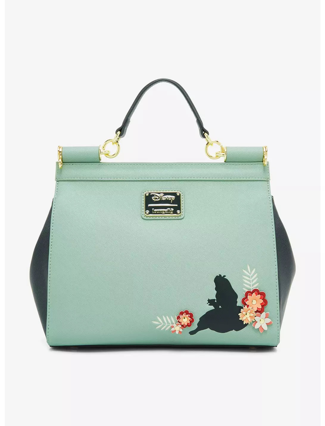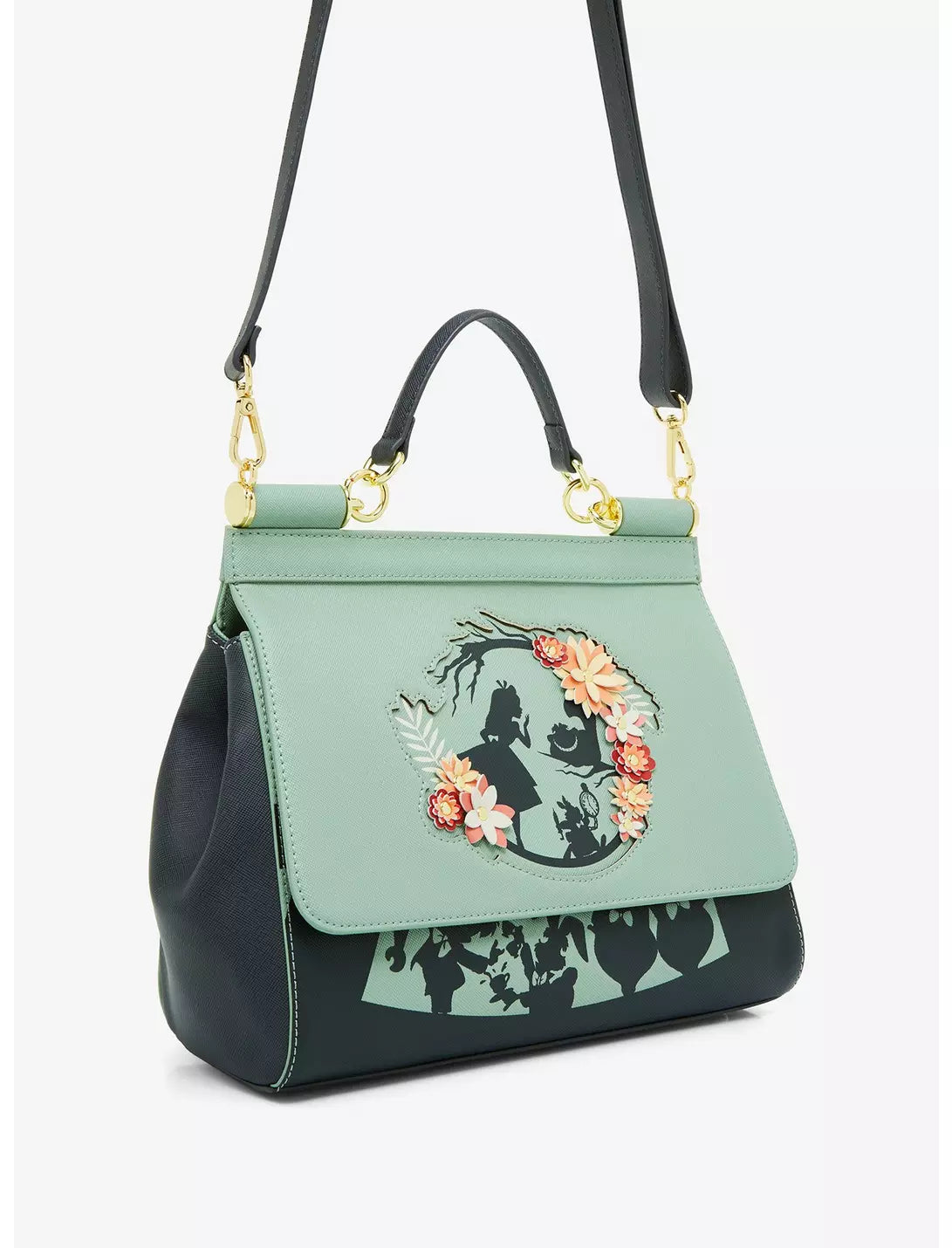 Get ready for a very important date with this Alice in Wonderland-inspired handbag! Featuring a die-cut silhouette portrait of Alice, the White Rabbit, and the Cheshire Cat, the front flap also includes applique flowers. With silhouette portraits of other characters on the body, this bag includes a top handle and a removable crossbody strap, perfect for preparing for your next adventure in Wonderland.