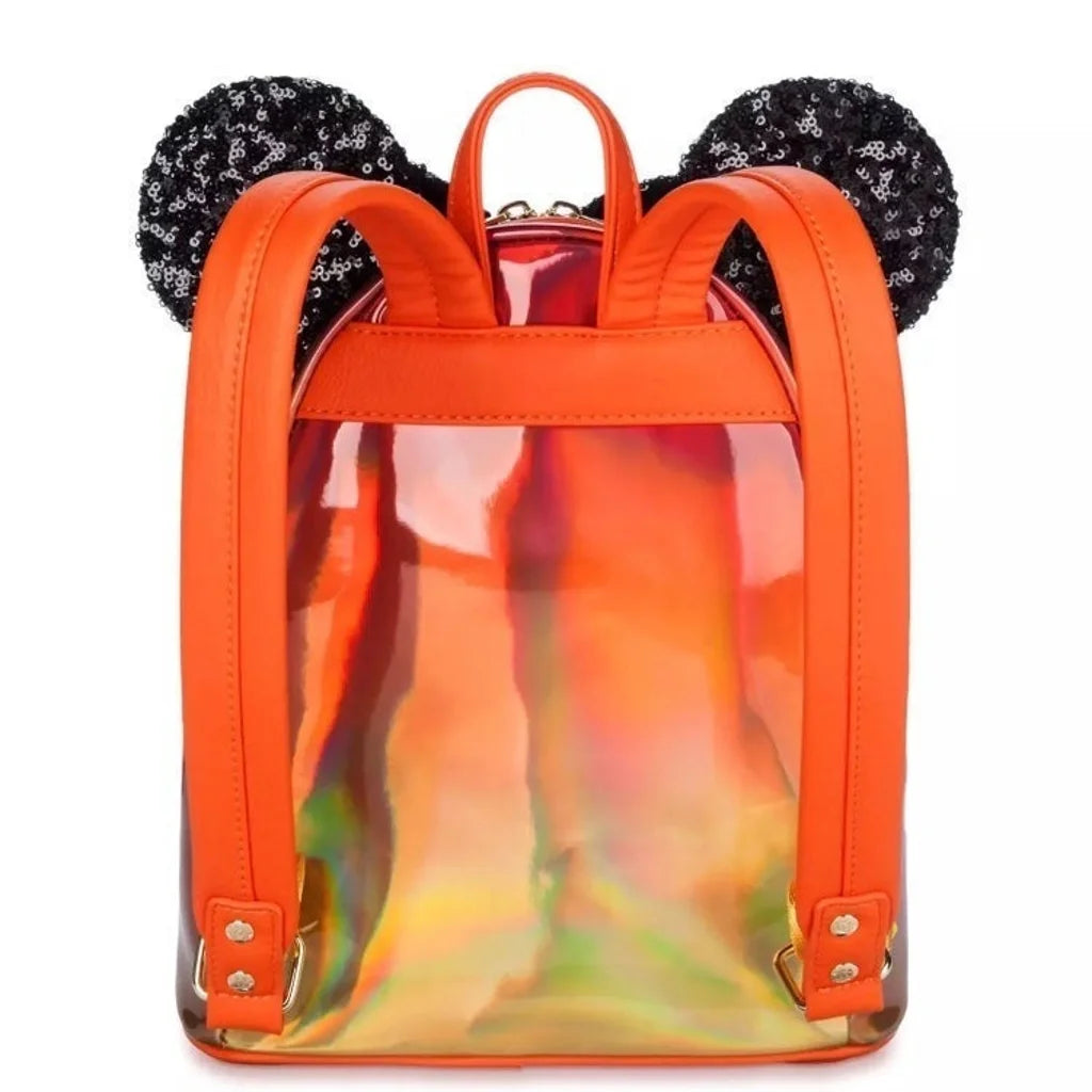 Minnie fans will take a shine to this glamorous mini backpack from Loungefly. The iridescent glossy vinyl shell has a two-tone orange and yellow appearance depending on how it catches the light. This contrasts dramatically with the black sequins on the 3D ears, bow and front pocket, creating a frightfully fashionable bag with a haunting Halloween color scheme.