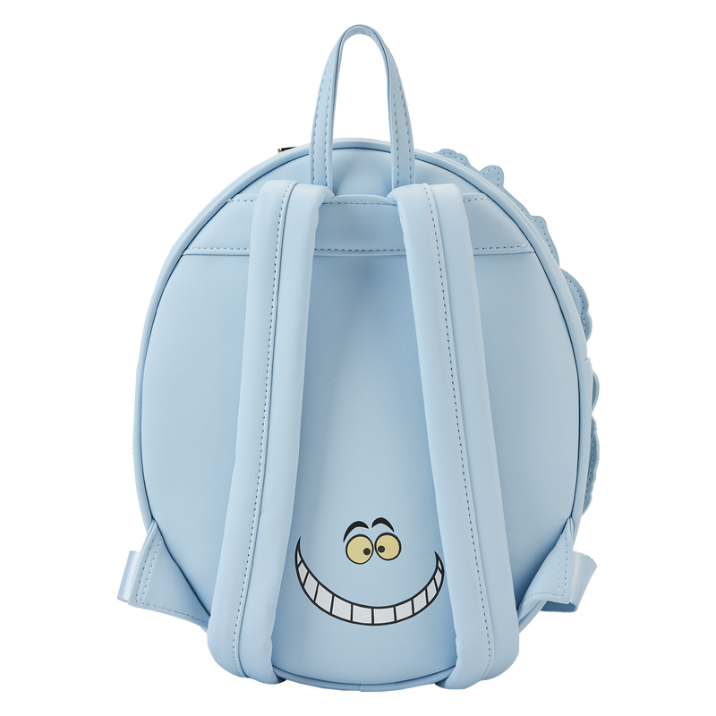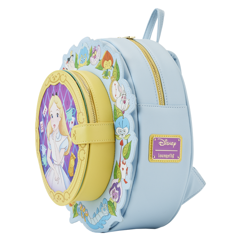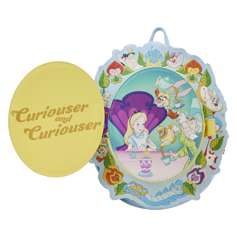 A vision of wonder awaits! From cameo appearance to starring role, take center stage with our exclusive Loungefly Disney Alice in Wonderland Cameo Mini Backpack. The backpack, which is oval-shaped, features a cameo-style image of Alice. She looks pensive as playing cards, a doorknob, and teacups circle around her. Gilded, decorative edges, in applique and debossed detail, include special appearances by the Caterpillar, various Playing Cards, the White Rabbit, flowers, the Cheshire Cat, the Red Queen, and more. A flap with a magnetic snap allows you to open the cameo portrait. On the inside flap, you’ll see the words “Curiouser and Curiouser.” The interior scene shows Alice at the Mad Hatter’s tea party. On the back, the Cheshire Cat’s smile materializes.