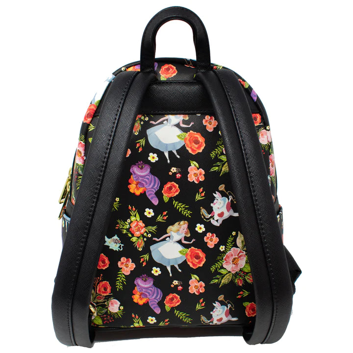This mini backpack features an all-over print of Disney's Alice In Wonderland themed designs and floral patterns on a PU leather base. dual reinforced padded shoulder straps, top handle, front exterior zipped pocket, two side exterior pockets, fully lined interior, and top zip closure.