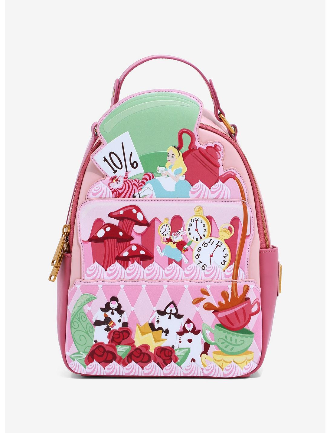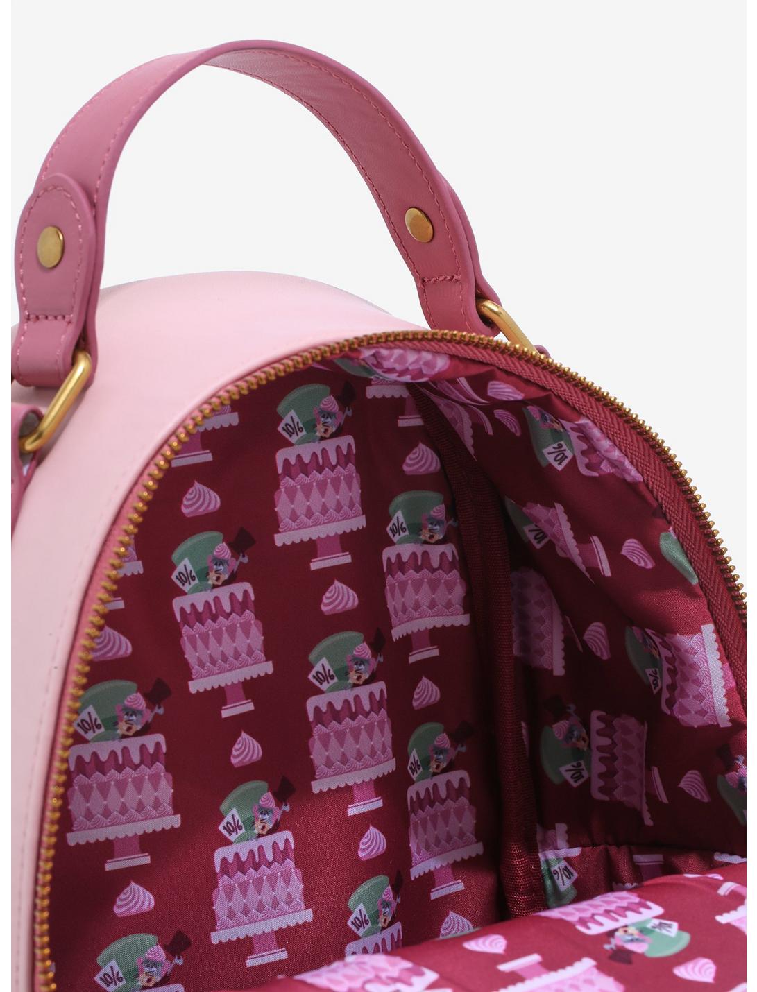 Throw a tea party wherever you go with this Alice in Wonderland mini backpack! Alice, The White Rabbit, and more classic Disney icons appear in a giant cake appliqué on the front. This bag features a main zipper compartment, side pockets, adjustable shoulder straps, and a cake detail on the back.
