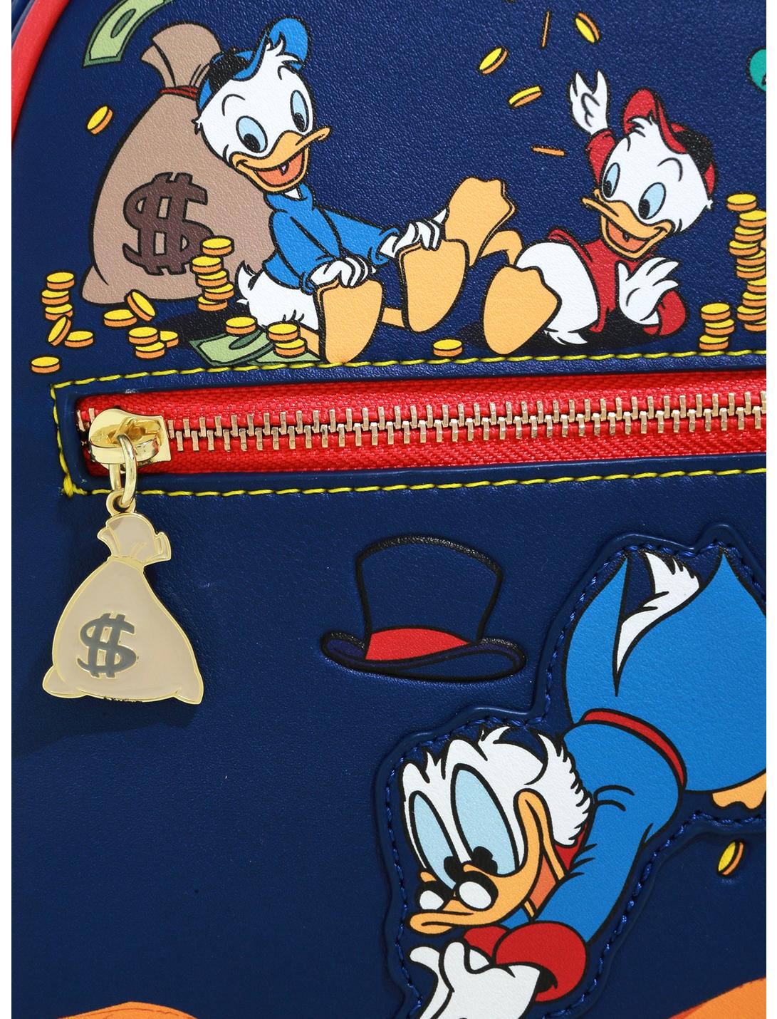No one causes a rucksack ruckus like Huey, Dewey, and Louie! The three brothers are featured with their great-uncle, Scrooge McDuck, who can be seen diving into his gold—his favorite activity! This faux leather Loungefly backpack features gold-toned hardware, a sack of gold zipper pull, and a gold-inspired interior lining with interior drop pocket. With the help of the adjustable shoulder straps, you'll have no problem carrying around your own sacks of gold in this backpack inspired by Disney's DuckTales!