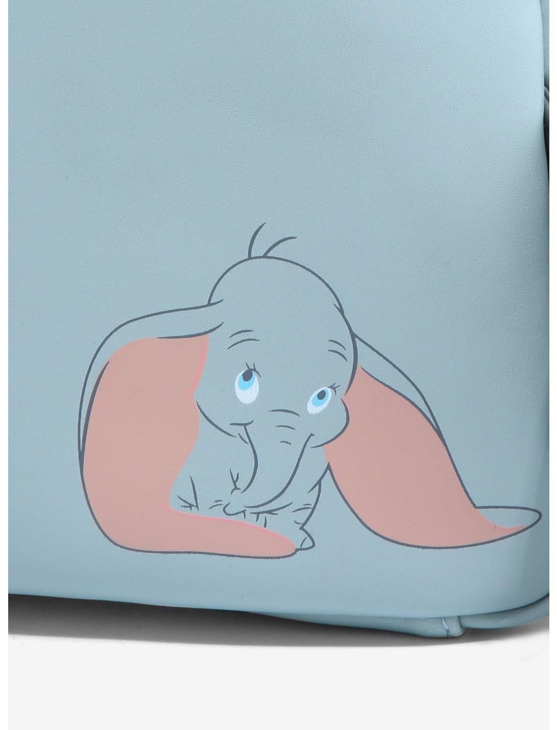 Dumbo wants to help your outfits soar to new heights as this adorable Loungefly mini backpack! Inspired by the Disney animated classic, the lovable big-eared elephant lends his look to this bag, with his ears appearing as figural appliqué details that can be buttoned closed to the front pocket with the snap button closures. Unbutton to reveal a portrait of Dumbo, complete with embroidered eyes and appliqués of his hair on top. Also features silver-toned hardware, an enamel brand badge, adjustable shoulder straps, and an allover print interior lining pattern.