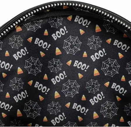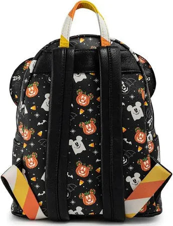It’s a not so scary design, for an oh so sweet season! The Loungefly Disney Spooky Mickey and Minnie Mouse Candy Corn Mini Backpack with Ears Headband is a great way to complete your autumn outfit or accessorize for trick-or-treating. The pattern on the backpack and Disney Ears headband features Mickey Mouse and Minnie Mouse as ghosts, jack-o-lanterns, and jack-o-lantern bats. The colors are reminiscent of candy corn, with white, golden yellow, and orange over a black background. The backpack even has front pocket specifically for holding your headband. This spectacularly spooky set is the perfect finishing touch to a Disney Halloween outfit.