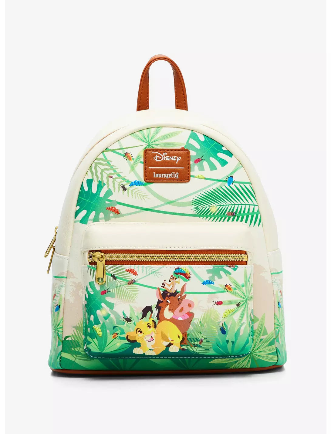 mini backpack! This style shows a jungle scene with Simba, Timon and Pumbaa on the front pocket. Interior pocket and adjustable straps.