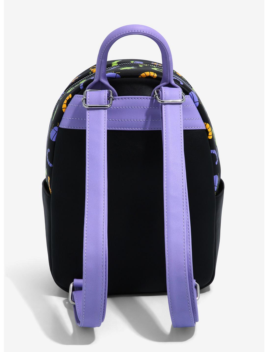 Roll the dice on this black mini backpack from The Nightmare Before Christmas! Featuring a chibi version of Oogie Boogie who glows in the dark and his gang on the front zipper pocket, plus bugs and dice in neon colors. Complete with a worm front zipper charm, side pockets and interior zipper pocket.