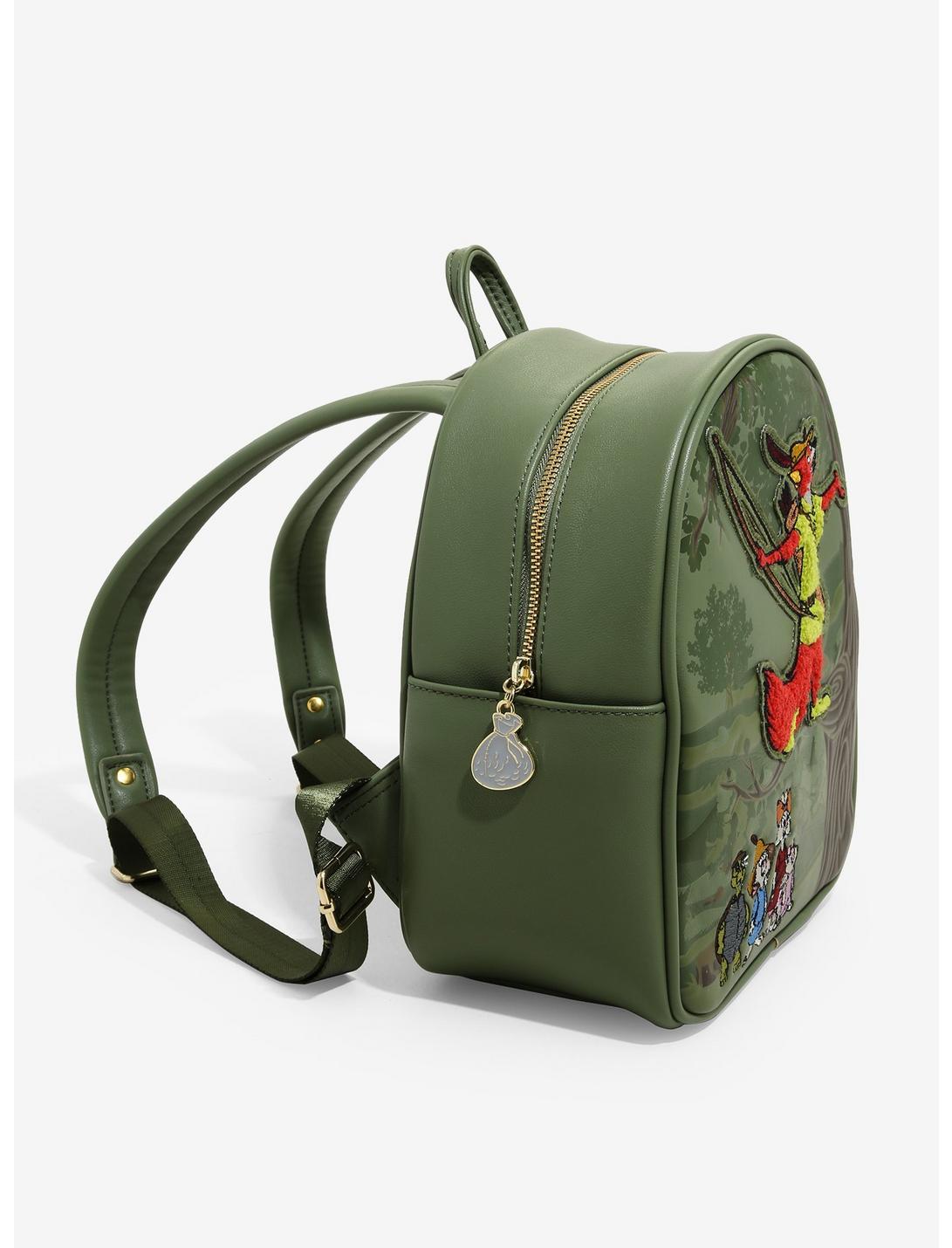 Ooh de lally! Robin Hood, Little John, and his band of Merry Men are more than happy to join you on your adventures! Inspired by Disney's Robin Hood, this faux leather Loungefly mini backpack features embroidered characters and debossed details on the exterior—including a chenille Robin Hood patch. Additional details include a main zip compartment, interior zip pocket, interior lining with an allover quote and icon pattern, two side pockets, gold tone hardware, and adjustable straps.