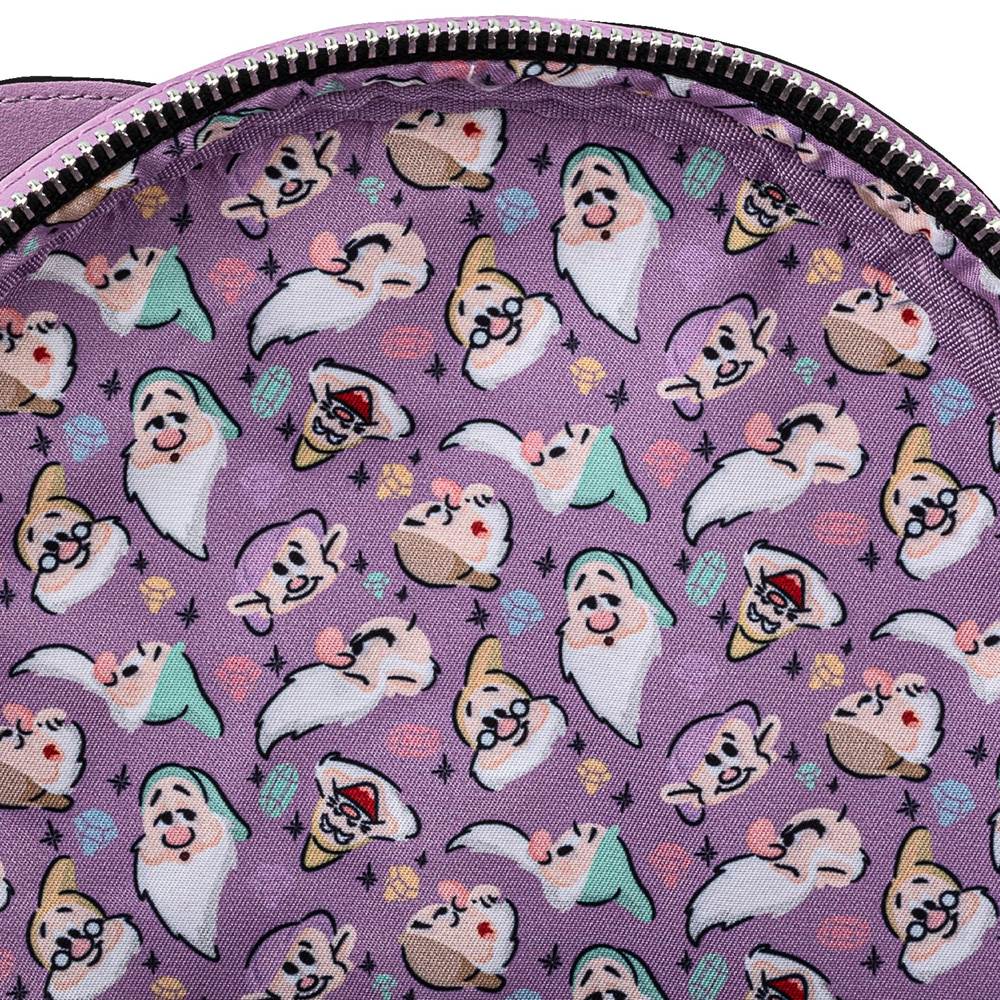 This adorable Loungefly Dopey Cosplay Mini Backpack is made with faux leather and features embroidered eyes & nose, and he's hiding within a minecart full of faux leather gemstones. Hidden behind the sparkly gemstones is a front zip pocket. The lining features all 7 dwarves and on the back is a detail image the gemstones and the "Heigh-ho heigh-ho" phrase.