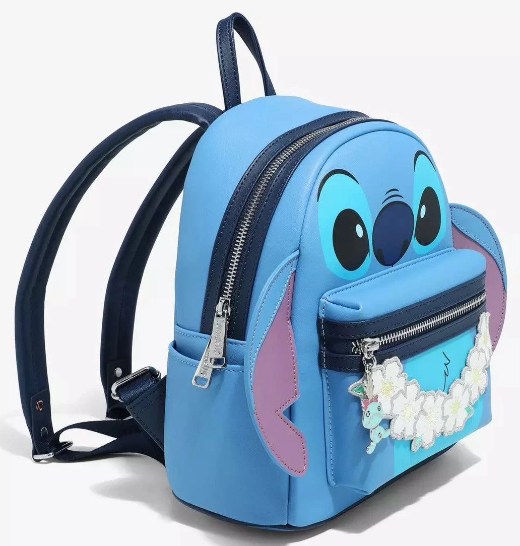 Add a tropical vibe to your look with this Lilo & Stitch-inspired mini backpack! Featuring a design of Stitch's face on the front with a lei applique on the front pocket, this bag also includes applique ears on the sides. With a figural Scrump zipper pull on the front pocket, adjustable straps, and a floral interior lining, this bag is perfect for trips to the beach, Disney Parks, and beyond.