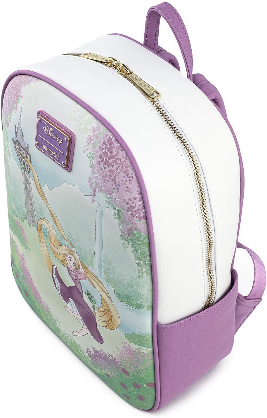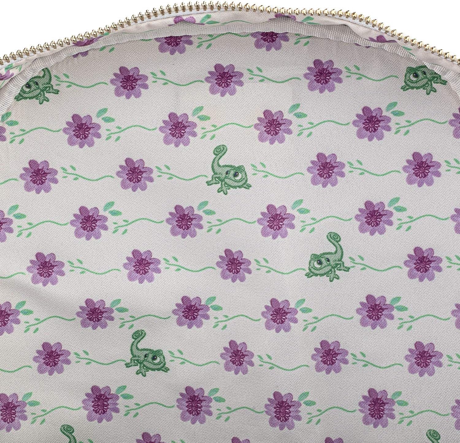 Get ready for the best day ever with this adorable new Tangled inspired backpack by Loungefly. The front of this bag features Rapunzel and Pascal having just escaped from their tower. Framed by a beautiful floral border, and a bright fuchsia piping, this backpack is a great addition to any whimsical wardrobe.