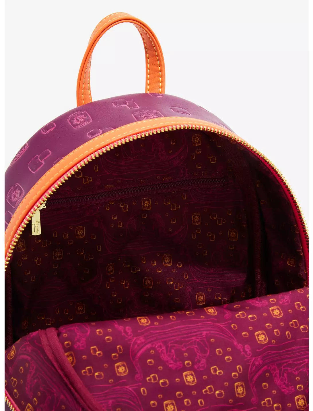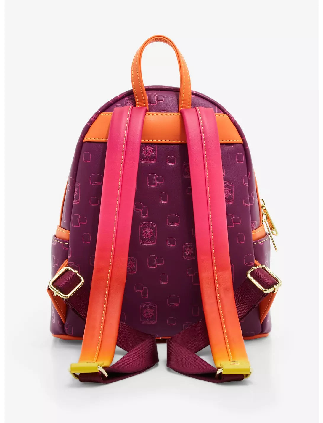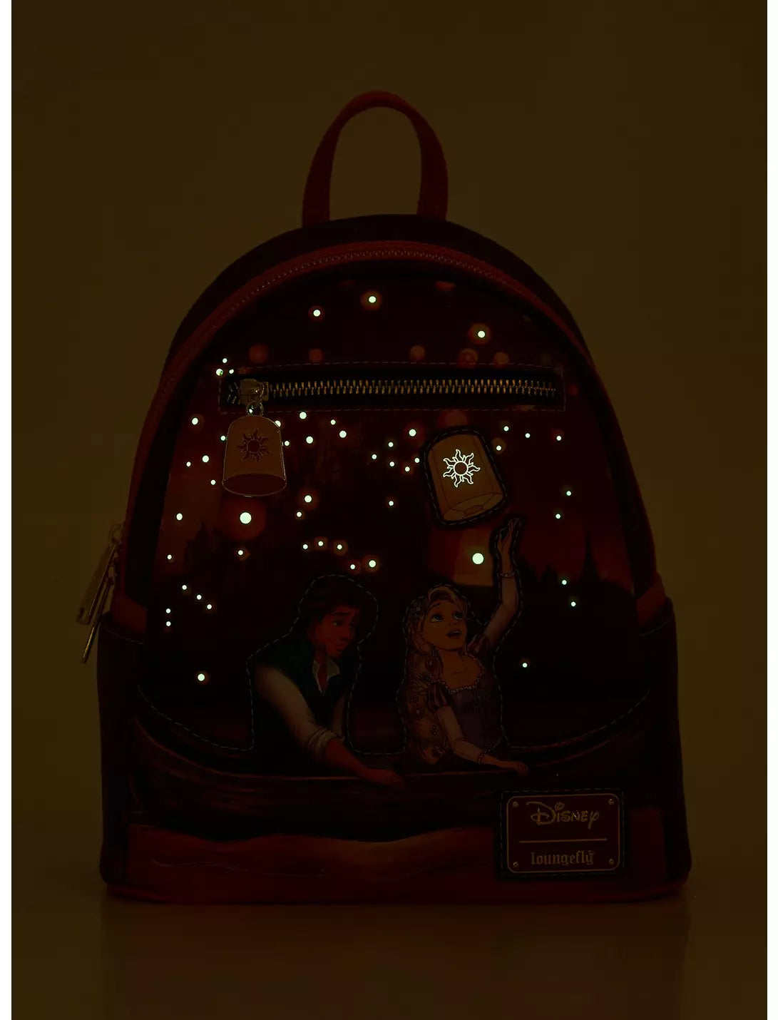 Bring some glowing Disney style to your wardrobe with this Tangled-inspired mini backpack! Featuring an applique of Rapunzel and Flynn on the front, this bag also includes a zippered pocket with a metal lantern zipper pull and glow in the dark details. With debossed lanterns along the body of the bag, this backpack is perfect for trips to the Disney Parks and beyond.