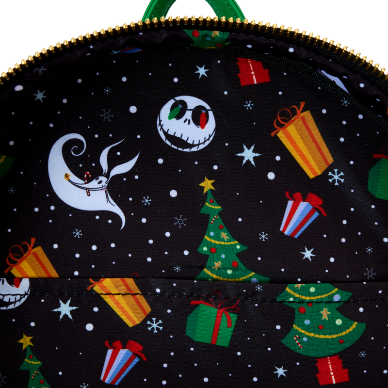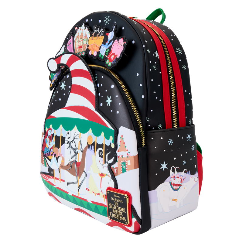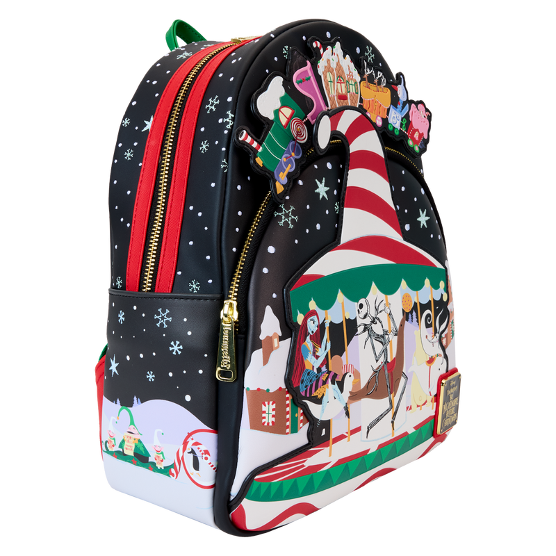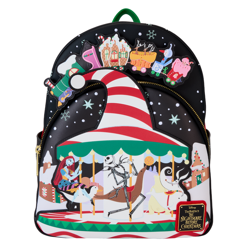 Up and down and ‘round we go! Jack and Sally take Christmas Town for a spin on this whimsical mini backpack. Slide the train back and forth to set things in motion, and turn down the lights to witness a glowing nighttime spectacular! This accessory makes a festive addition to any outfit and will inspire holiday spirit wherever you go.