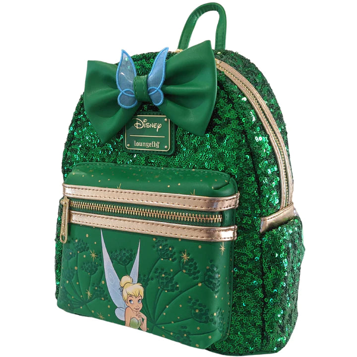 All you need is faith, trust and this adorable Loungefly Disney Tinkerbell Green Sequin Mini Backpack, featuring printed and debossed details, shiny gold hardware, a front zip pocket, 2 side pockets, bow with wings, and sequins galore!