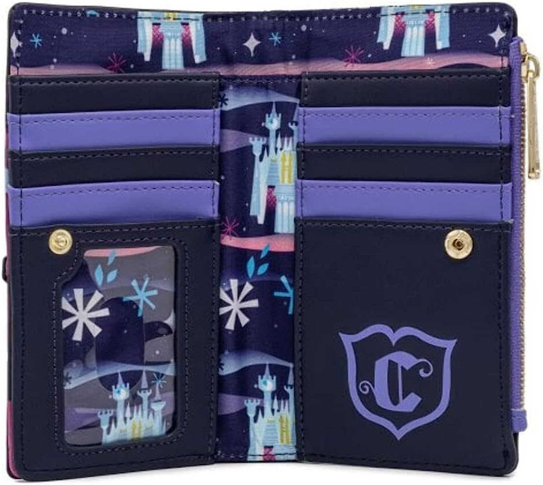 The Disney Cinderella Castle Flap Wallet is made of faux leather, has a zip around closure, a snap closure, sturdy metal hardware, matching themed lining, and features applique, debossed, and printed details.