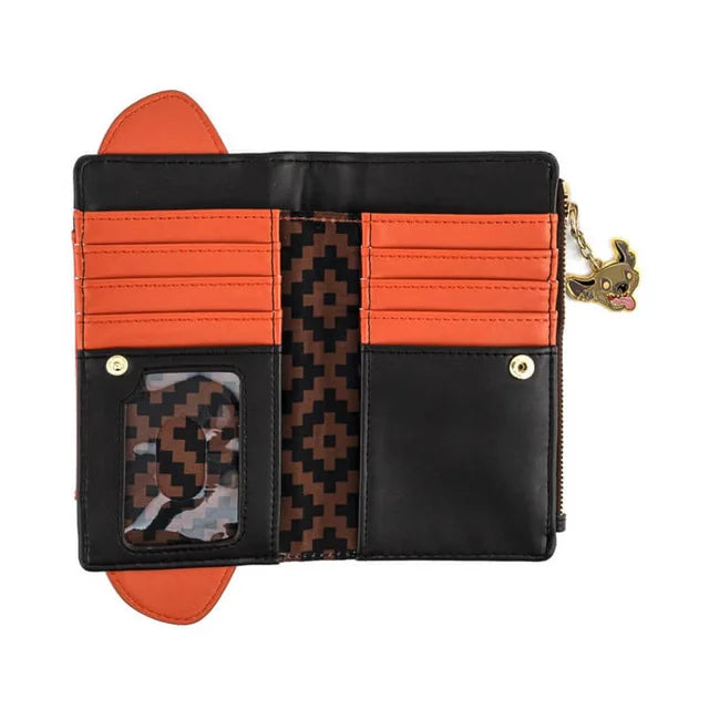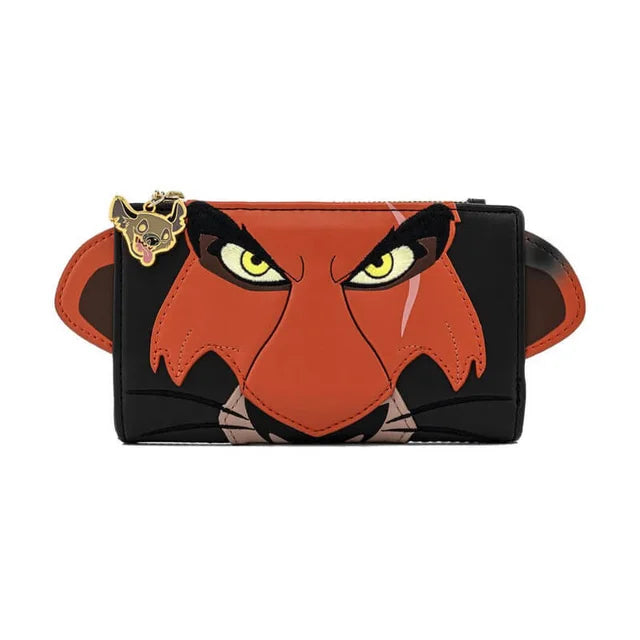 The Lion King Scar Cosplay Flap Wallet is made of vegan leather (polyurethane). Wallet snaps closed, has a zipper pocket, and features: hyena enamel zipper charm, printed, debossed, and applique details. Take note of the coordinating design of the inside lining fabric.