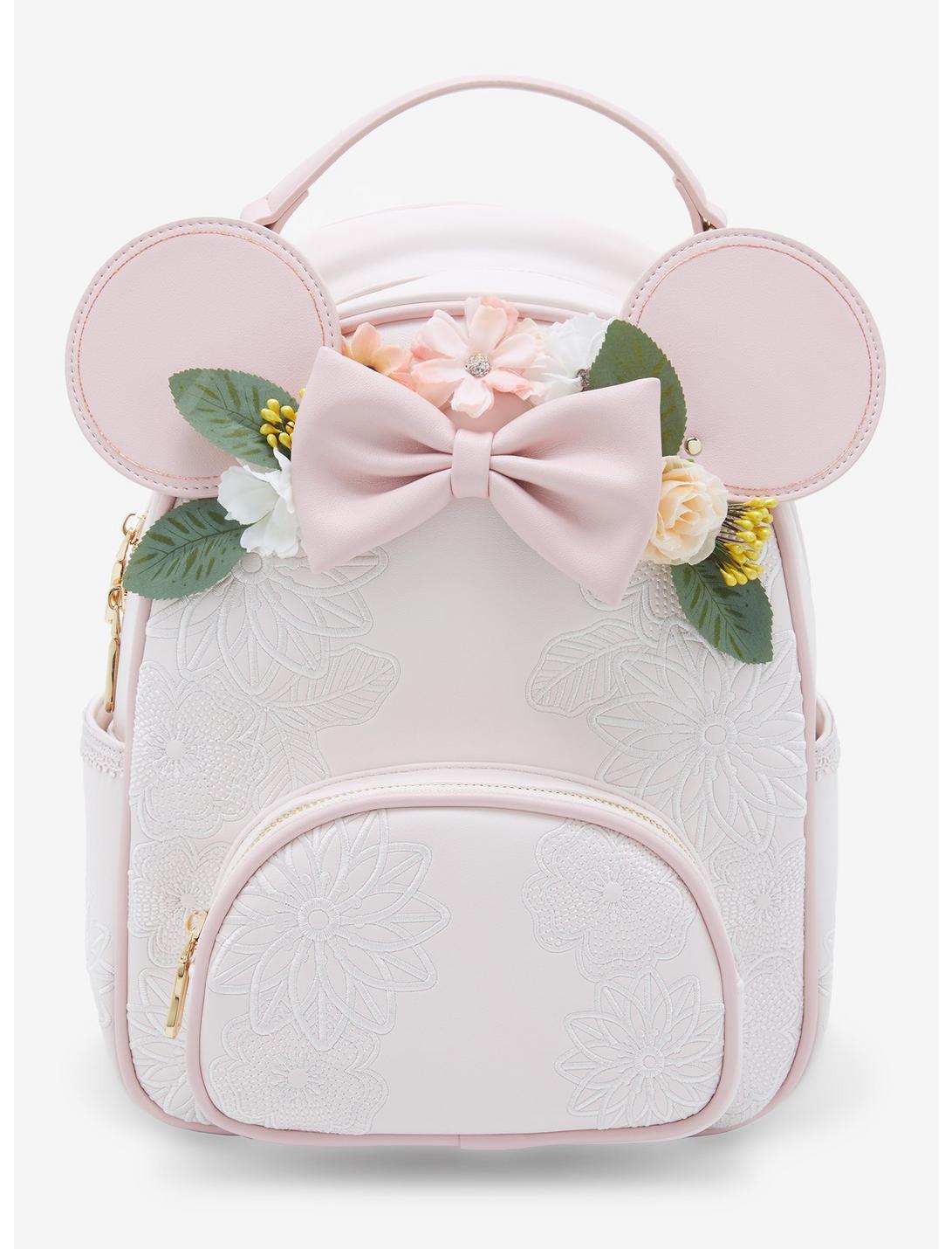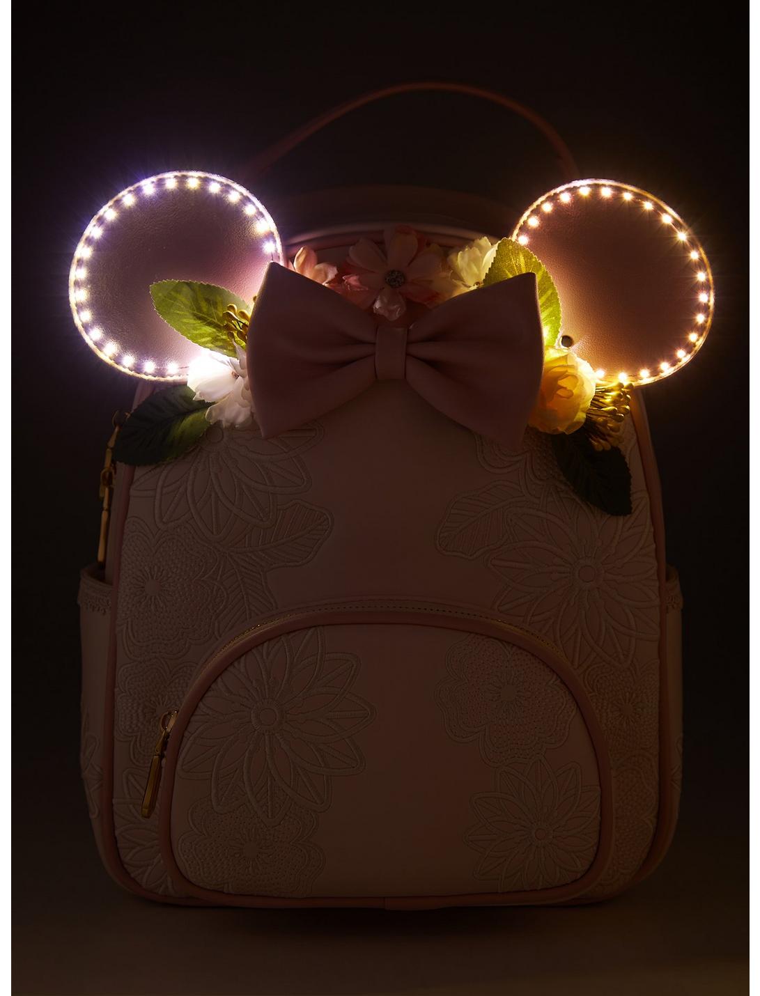 Bring some floral Disney magic to your outfits with this Our Universe mini backpack! Featuring an embroidered allover floral design, this bag has fake flowers, light-up Minnie Mouse ears, and braided adjustable straps. With front and side pockets, this backpack is perfect for carrying your everyday essentials.