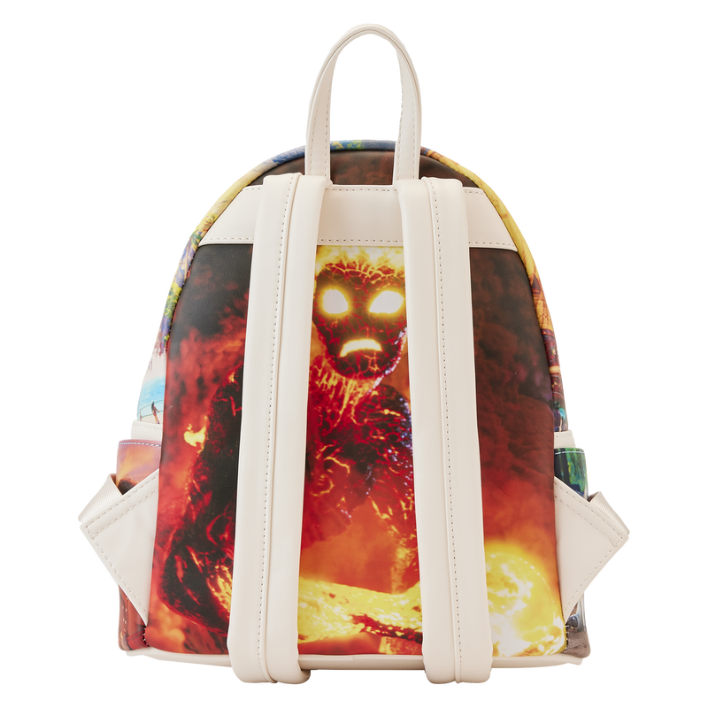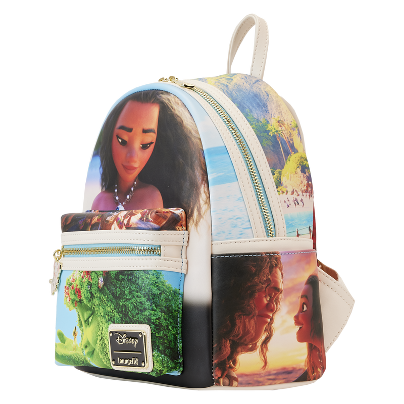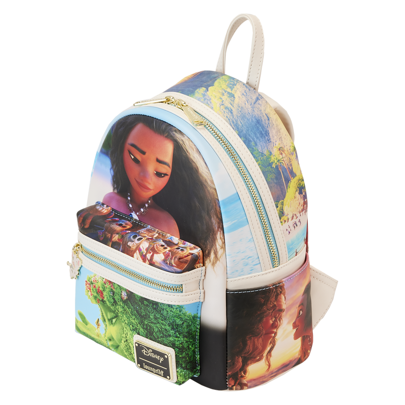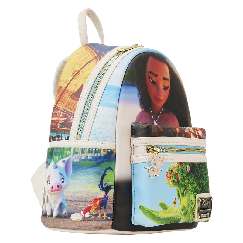 Introducing the Moana Princess Scene Series mini backpack from Loungefly! This vegan leather bag features printed artwork scenes of Moana, Te Fiti, and Kakamora on the front, scenes of Moana, Maui, Pua, and Hei Hei on the sides, and a scene of Te Kā on the back. Pua also appears on the front zipped pocket as an enamel keychain! The bag also features adjustable straps, an enamel charm, and printed details.