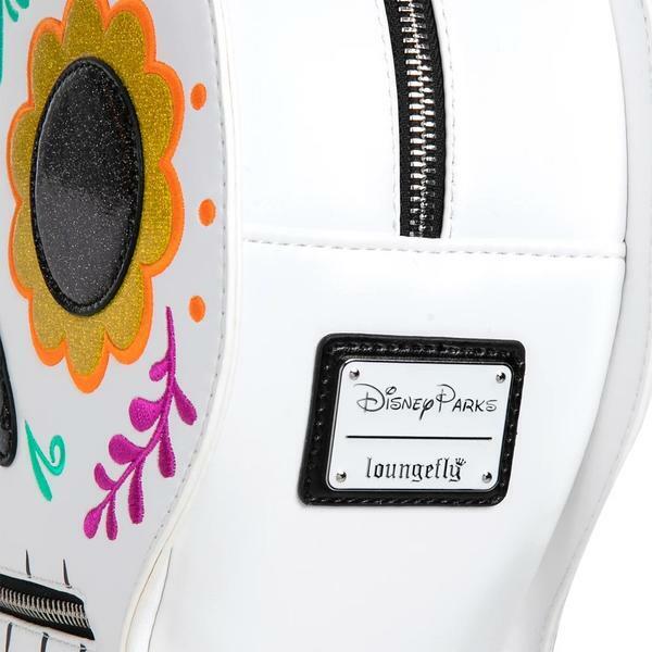 Make your look unforgettable with this Coco-inspired backpack by Loungefly. Accented with embroidered details and glittering appliqués, the sugar skull design has a small zip pocket for the mouth and a colorful lining featuring characters from the film.