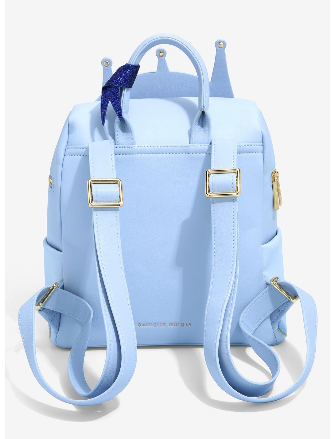 Channel your inner Disney Princess with this beautiful mini backpack from Danielle Nicole! Inspired by the animated classic, this bag features a design of Sleeping Beauty's castle on the front pocket and bag appliqué, decorated by beads and glitter for a fairytale-like look. Also features gold-toned hardware, a blue glitter ribbon on the handle, a die-cut brand badge and embossed Danielle Nicole logo on the back, and adjustable shoulder straps.