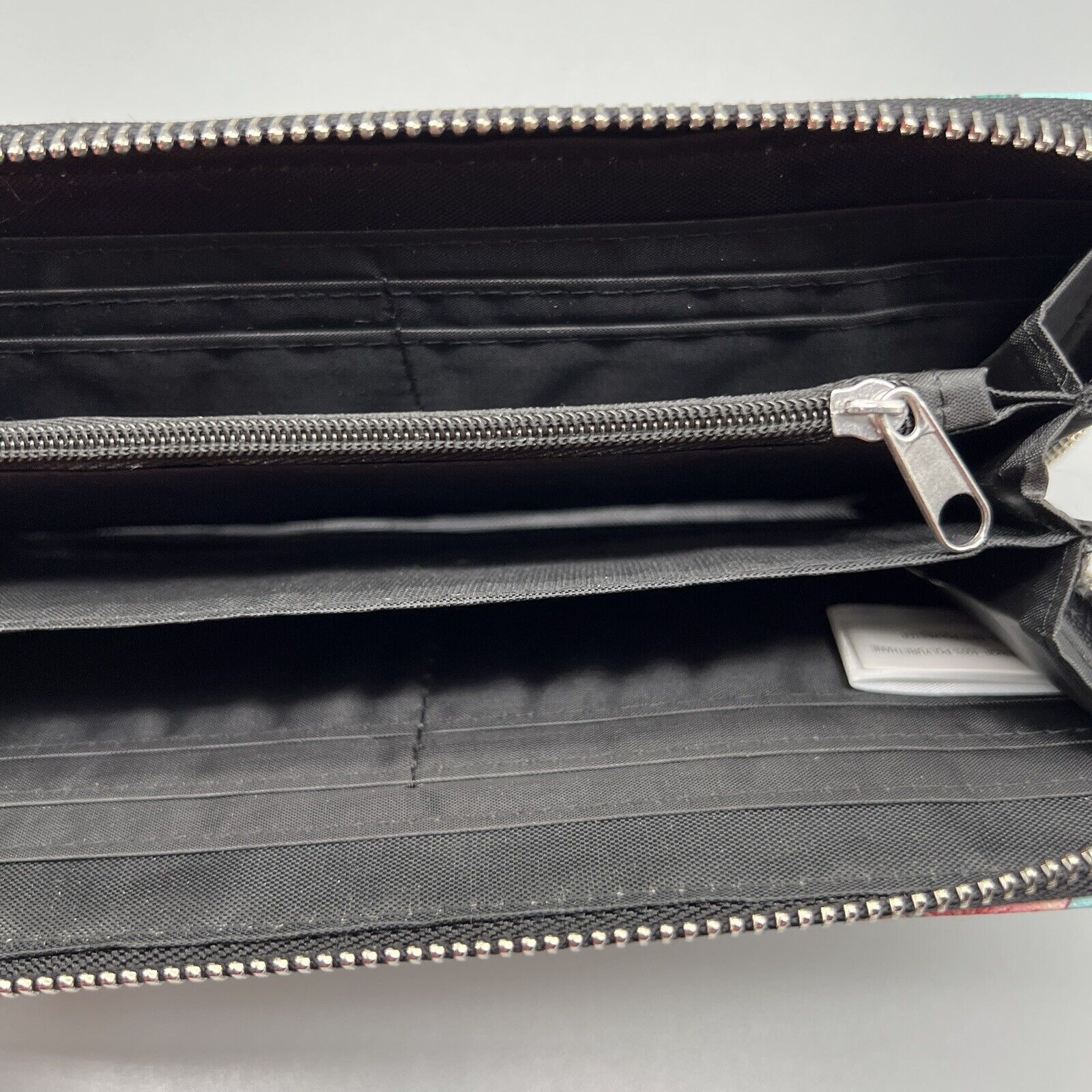 Carry your daily needs secure in this super cute wallet by Disney. This wallet features a stylized print of Ariel that stretches along the front and back. She is swimming in the middle of a lush, floral jungle pattern.