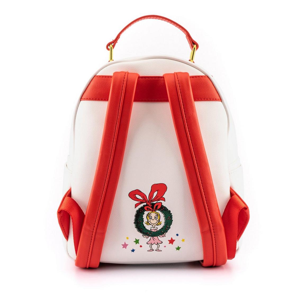 The Grinch is here to help! The famously cranky character from Dr. Seuss's How the Grinch Stole Christmas pokes out of the chimney in the classic style of the book on the front of this Loungefly mini backpack. Max looks on next to the enamel brand plaque. Features a front zipper pocket, gold-toned hardware, Seuss-themed interior lining, and interior drop pocket.