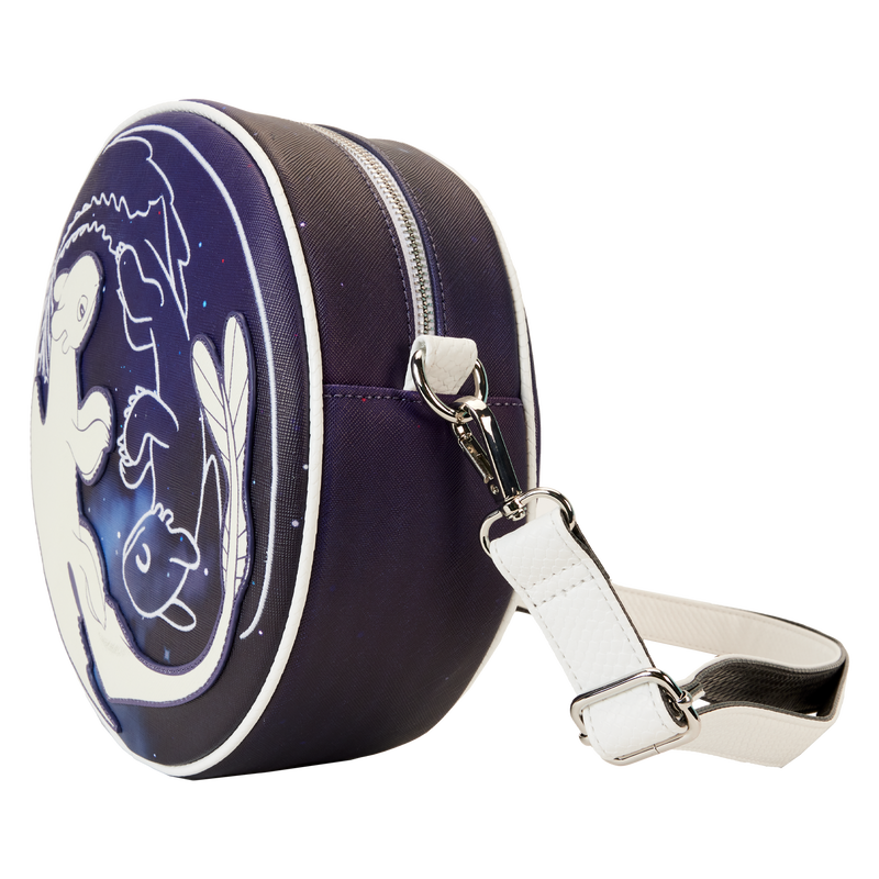 Soar through the skies with this beautiful crossbody of DreamWorks How to Train Your Dragon by Loungefly! This circular bag features the Light and Night Fury curled around the front in a pose reminiscent of the Yin and Yang symbol. The Light Fury is depicted in a white glow-in-the-dark applique and the Night Fury appears as a white outline, both over a starry night background. The back of the bag features the Light and Night Fury in fully printed art, enjoying a flight together through a starry night sky.