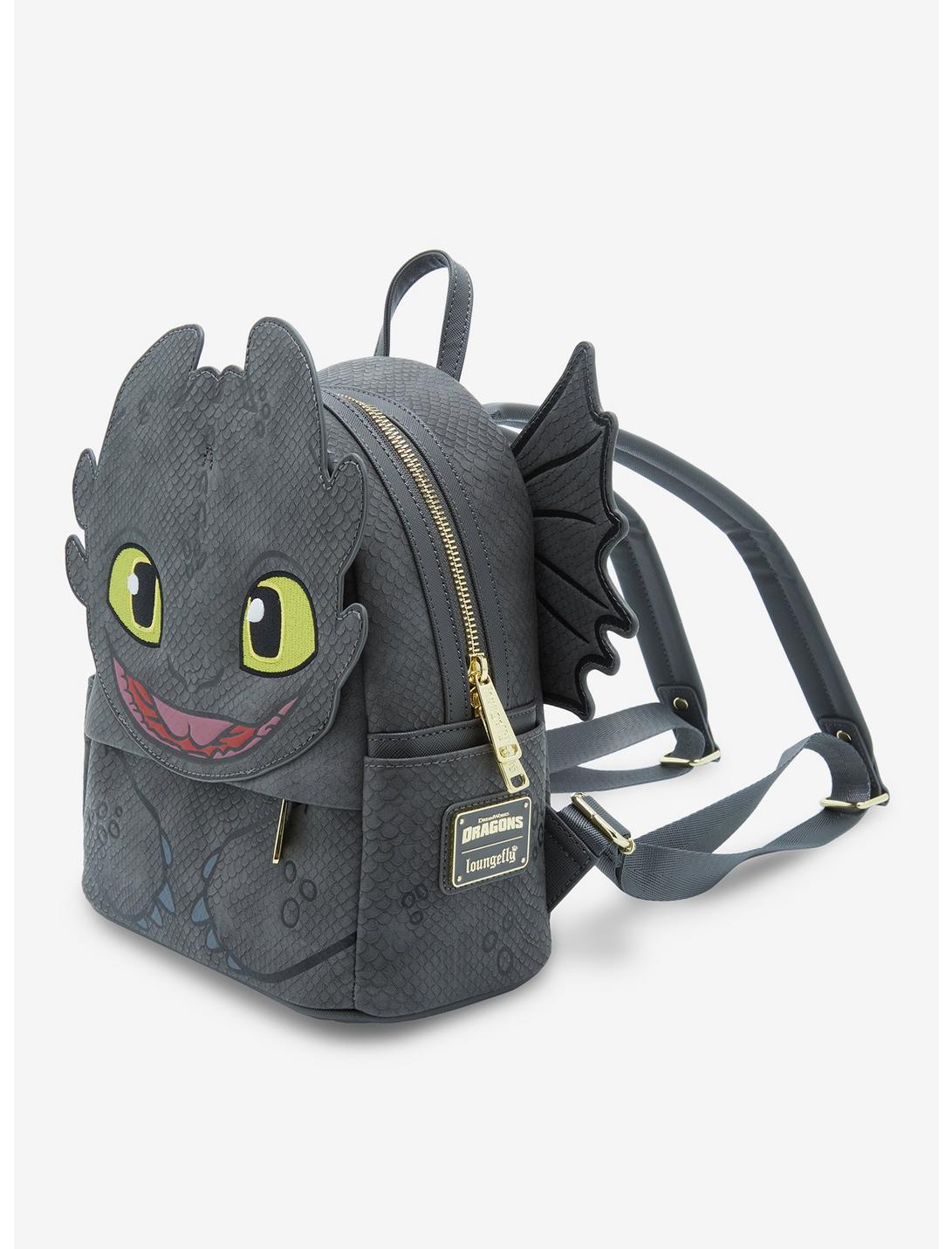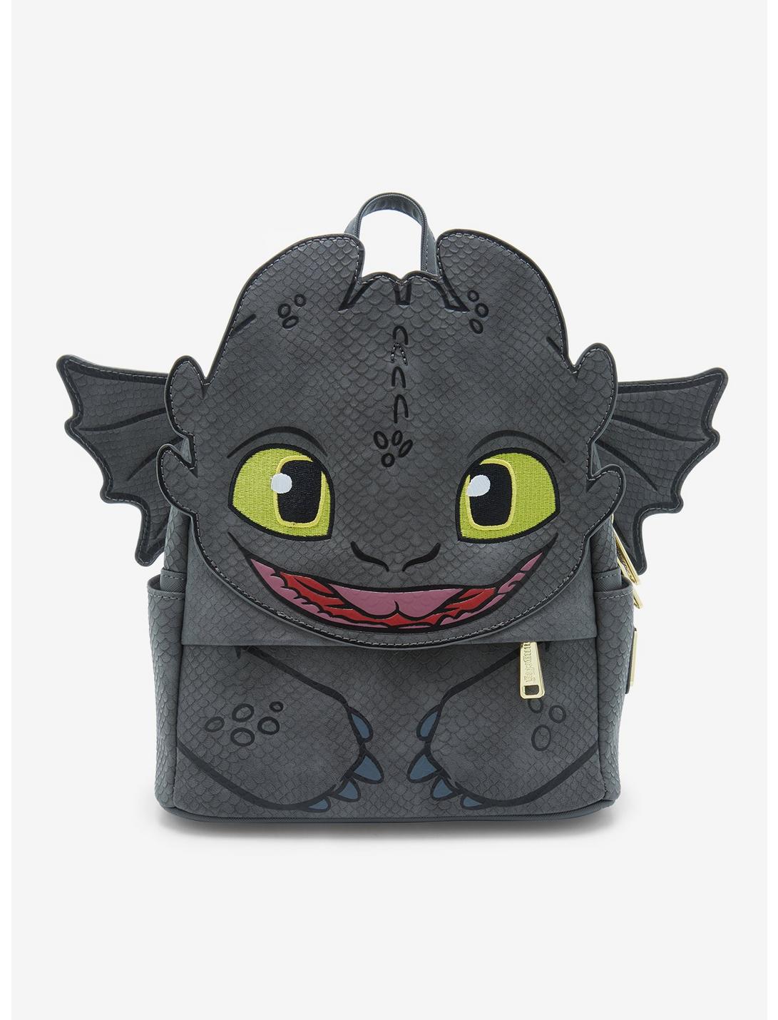 Add some Night Fury style to your look with this How to Train Your Dragon mini backpack from Loungefly! Toothless is showing off his signature style as the figural design of this bag. With debossed details to mimic his dragon scales, this mini backpack also features figural wings, a zippered front pocket, adjustable shoulder straps, and an allover portrait print interior lining.
