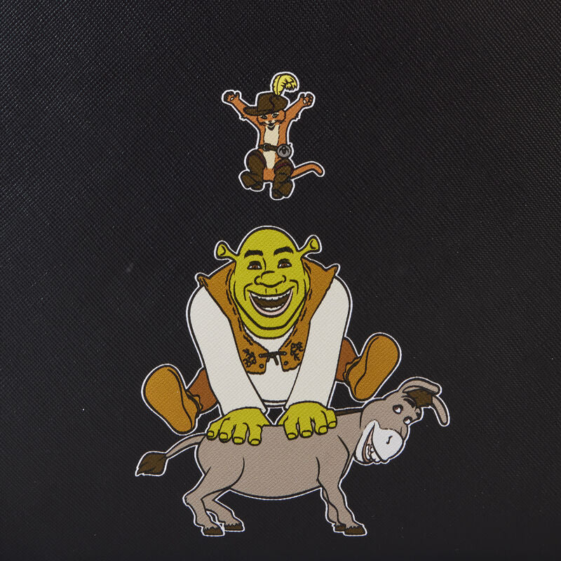 Heading to a place far, far away? Look fashionable in this DreamWorks Shrek 2 Triple Pocket Mini Backpack from Loungefly. This backpack features three front pockets, each one with a memorable Shrek 2 character on the front. On the bottom pocket, Shrek comes to life in applique detail, his ears sticking out on the sides. Above him, Donkey’s hooves are draped over Shrek’s shoulders, and Puss in Boots is on top, the applique feather in his hat rising over the backpack. Debossed detailing brings realistic detail to each character on each pocket. On the back, these characters make an encore appearance as printed images. Shrek leapfrogs over Donkey, and Puss in Boots leaps up over top. Turn everyday outings into fairy tale adventures with this roomy and fun backpack.