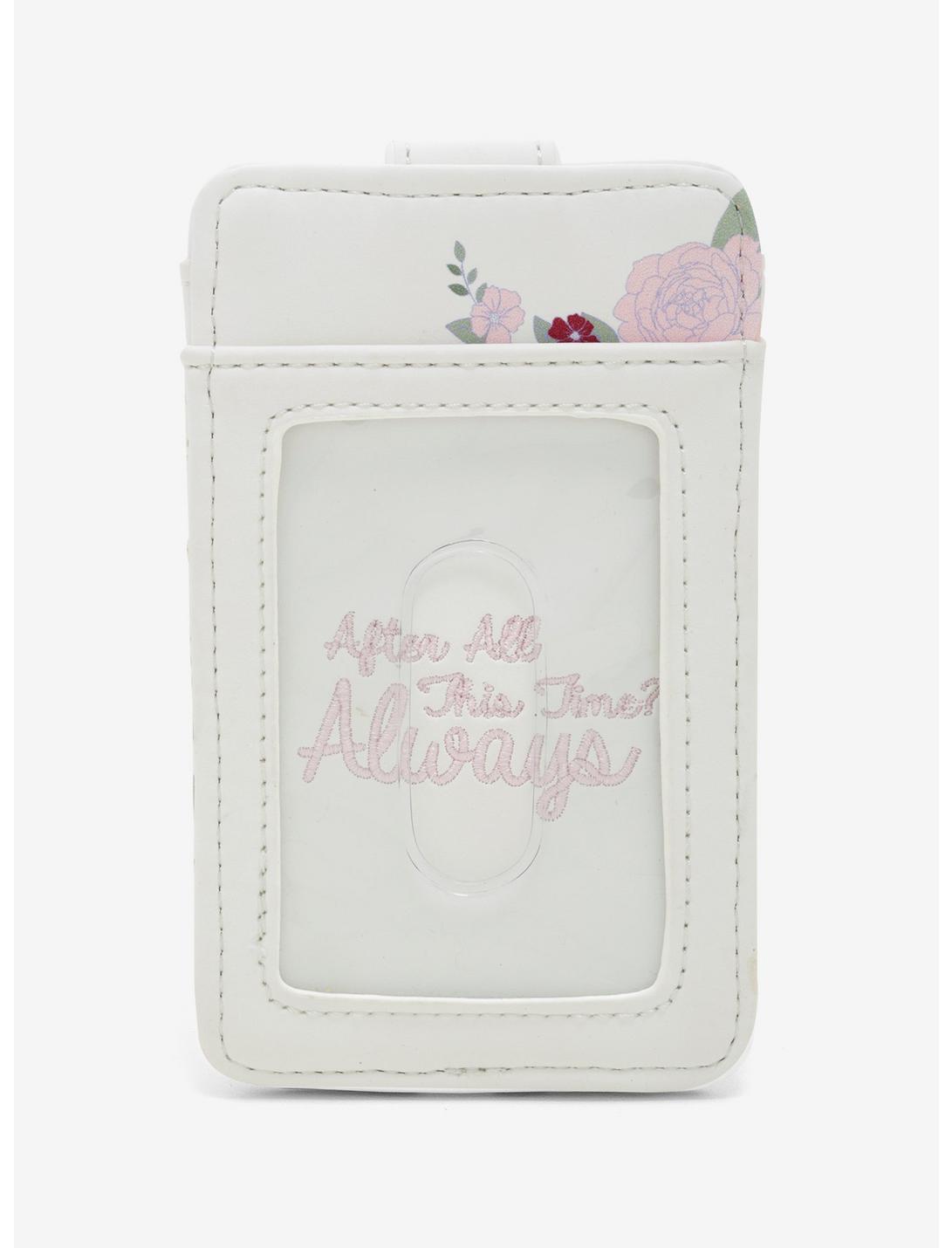 Shop in style with this Harry Potter cardholder, always. There is "After all this time? Always" embroidered text design behind the clear ID display. On the other side is 4 card slots with snap closure of a gold Hogwarts crest and "Always" embroidered text design. The pink & maroon floral design features