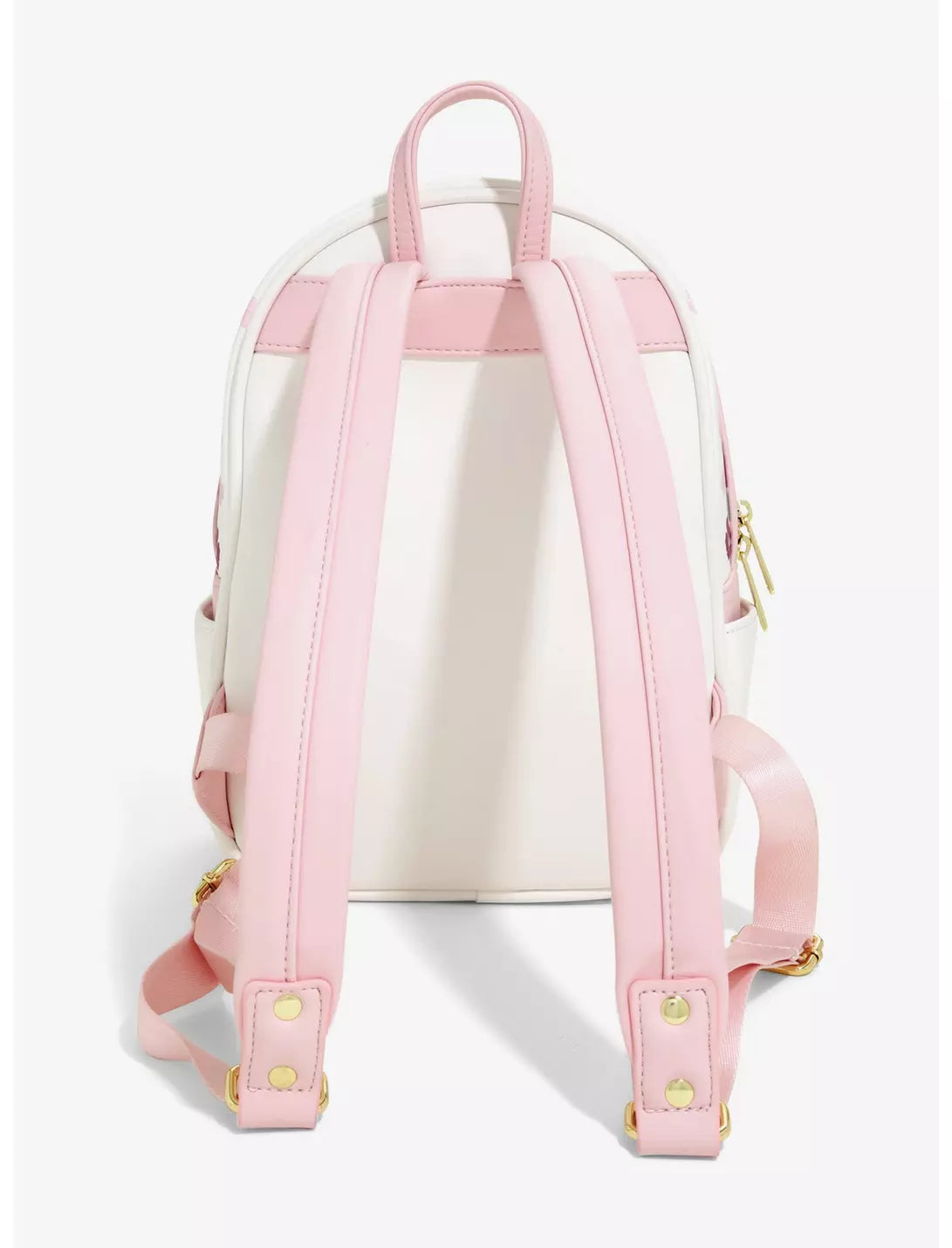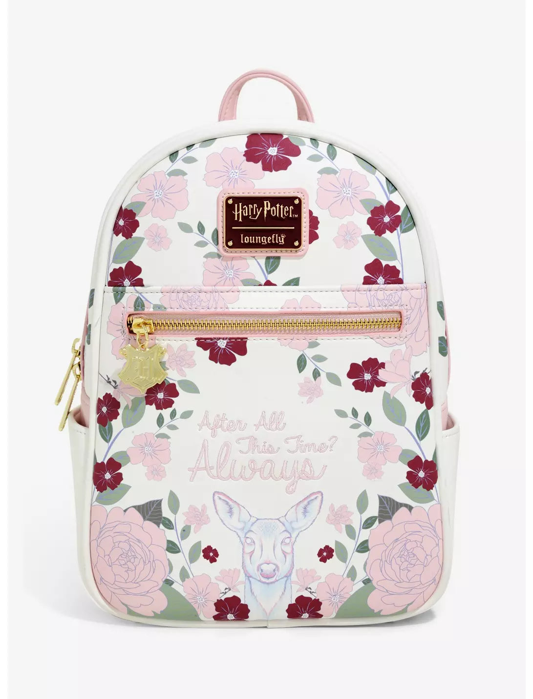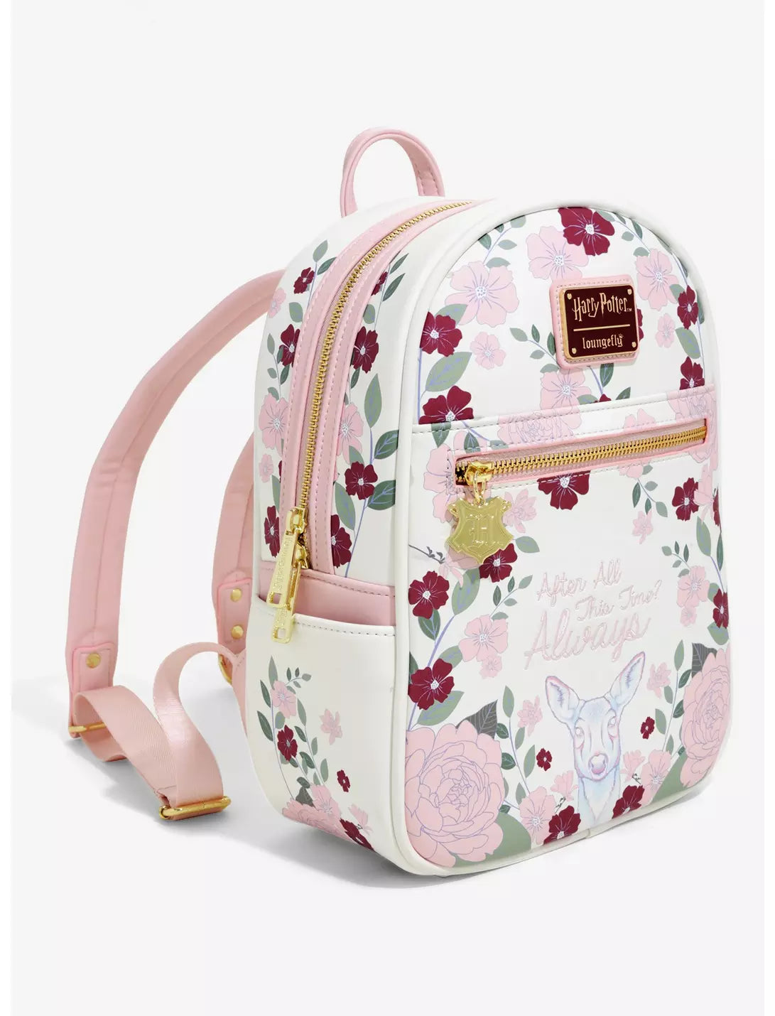 Shop in style with this Harry Potter mini backpack, always. There is "After all this time? Always" embroidered text design with Snape's doe patronus and pink and maroon flowers. Features gold tone hardware and a front zipper closure pocket with a gold Hogwarts crest zipper pull. There are small pockets on either side and adjustable light pink straps. The interior light blue lining features white Hogwarts crests and doe patronuses.