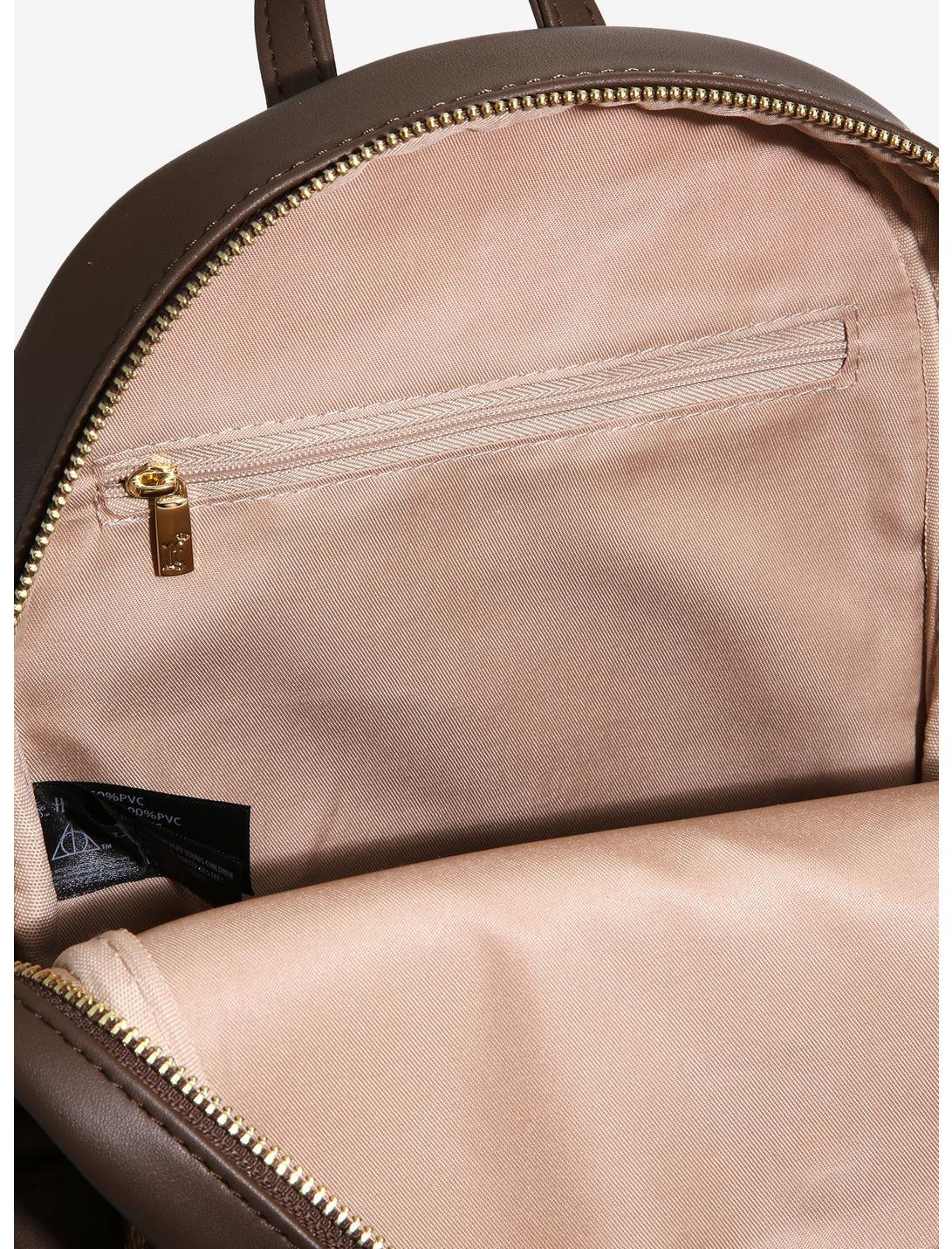 When Luna Lovegood and Hermione Granger have your back, you'll be unstoppable! The two virtuous witches from Ravenclaw and Gryffindor are featured alongside various Harry Potter iconography on this faux leather Loungefly mini backpack. Additional features include side pockets, a gold-tone Deathly Hallows symbol zipper charm, an interior zip pocket, and adjustable straps.