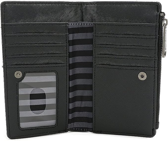 - Eight card slots; Three larger bill slots; Partially lined printed fabric interior