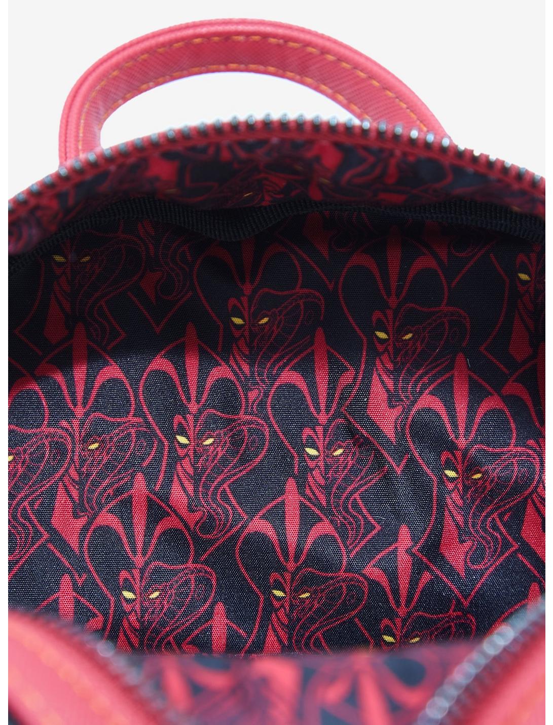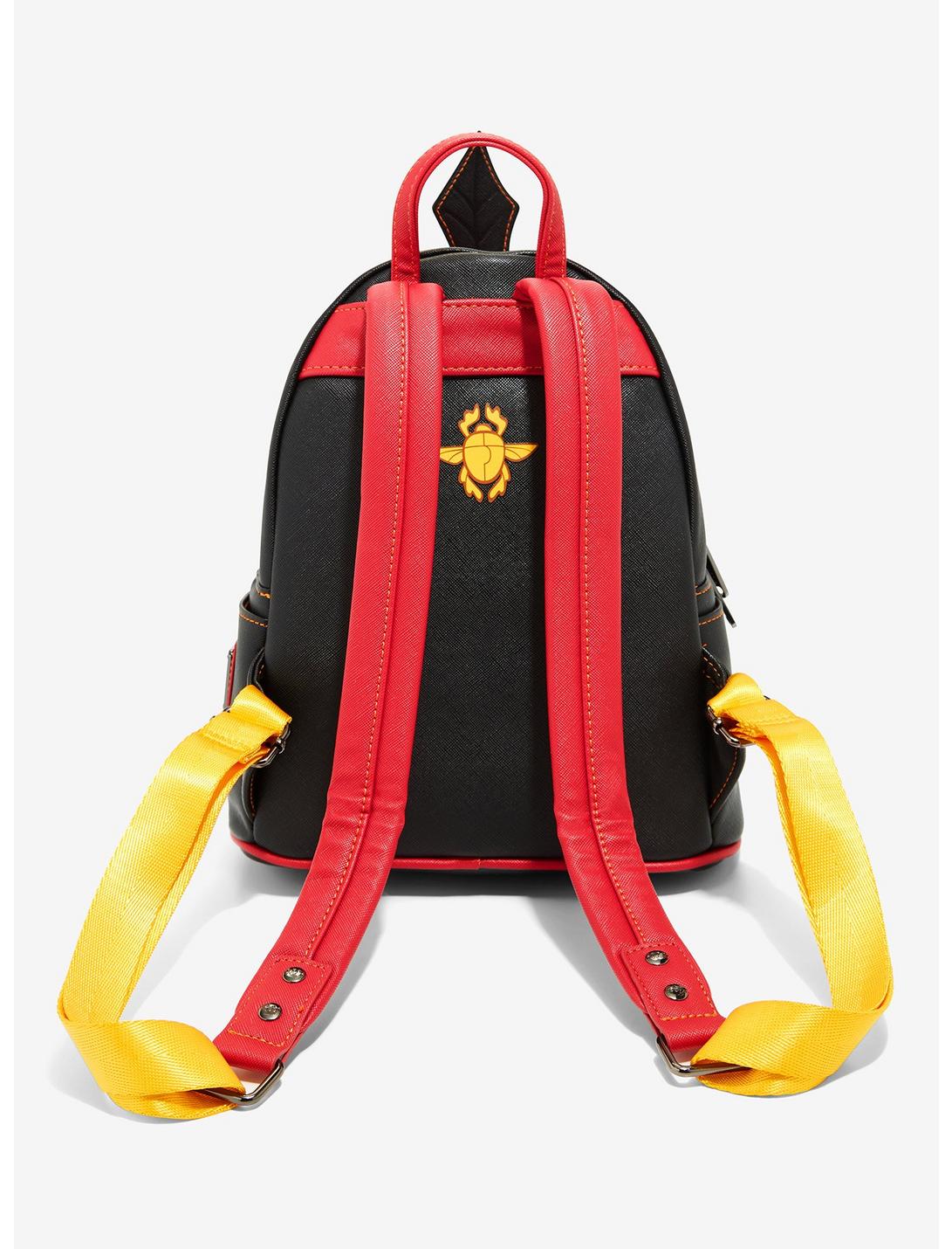 You won't need to summon Genie to add this stylish Loungefly mini backpack to your wardrobe! Inspired by Aladdin, the iconic Disney Villain, Jafar, decorates the top canvas of this bag, looking down on die-cut details on the front pocket design of Aladdin, Abu, and Flying Carpet entering the Cave of Wonders. With an enamel zipper pull of Iago, a die-cut appliqué of Jafar's headdress gemstone and feather on the top, adjustable shoulder straps, an enamel brand badge, and an interior lining pattern of a sinister looking Jafar, you can enjoy a whole new look for your adventures with this backpack.