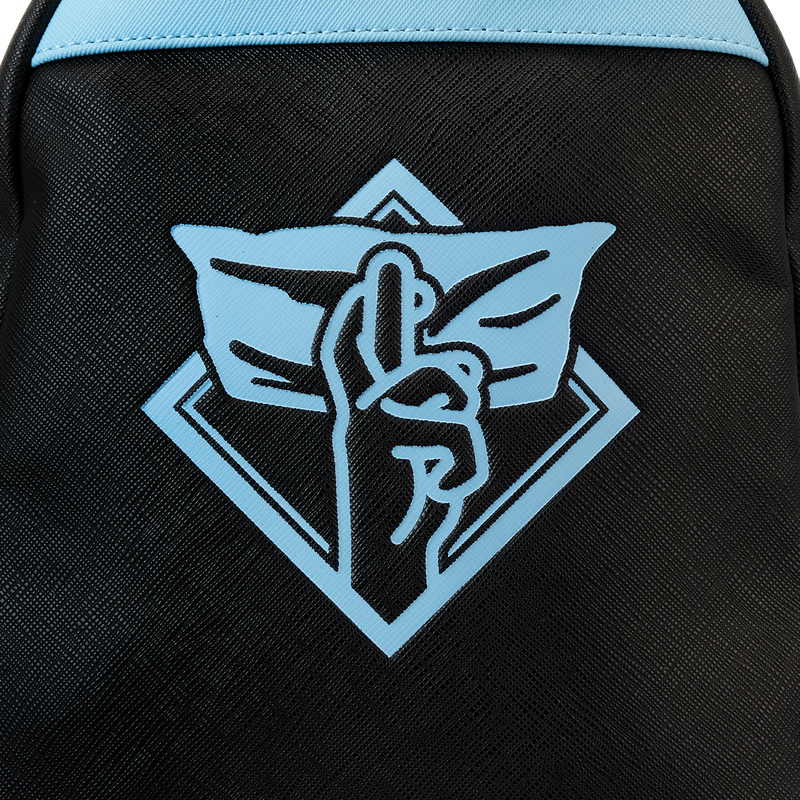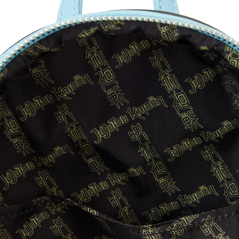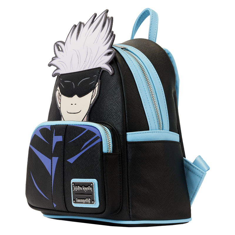 The Loungefly JUJUTSU KAISEN Satoru Gojo Cosplay Mini Backpack is made of vegan leather (polyurethane). Bag has adjustable shoulder straps and shiny silver hardware. Additional features include applique, debossed, and printed details. Take note of the coordinating inside lining.