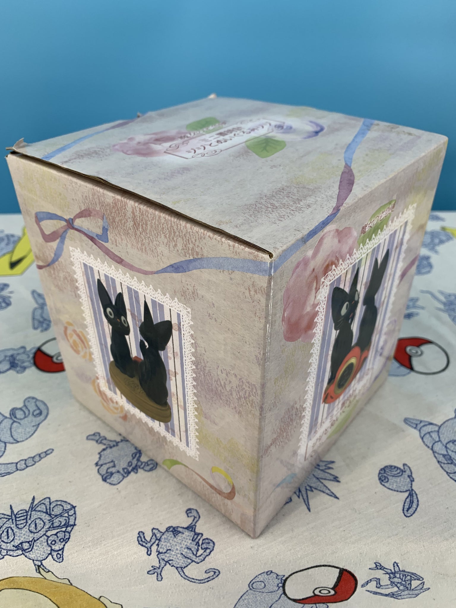 Jiji sits perplexed beside a stuffed plush Jiji atop a woodgrain pedestal with Kiki's iconic Delivery Service logo.