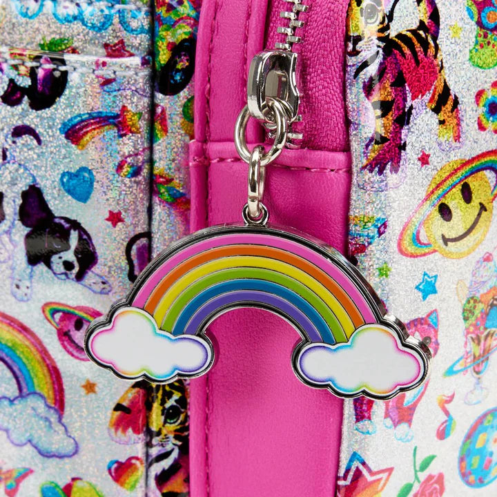 Add a delightfully fanciful style to your everyday with the Loungefly Lisa Frank Iridescent Allover Print Mini Backpack! Bring back your favorite rainbow sticker packs in the form of the perfect mini backpack with all the iconic characters. This faux leather bag also features iridescent adjustable straps, applique, enamel zipper charm, and printed details.
