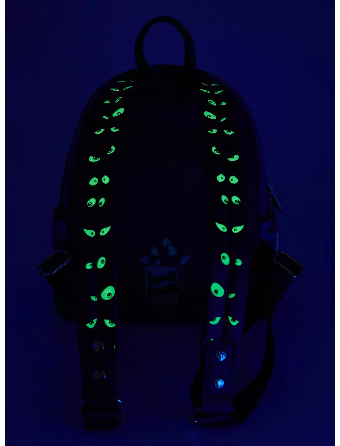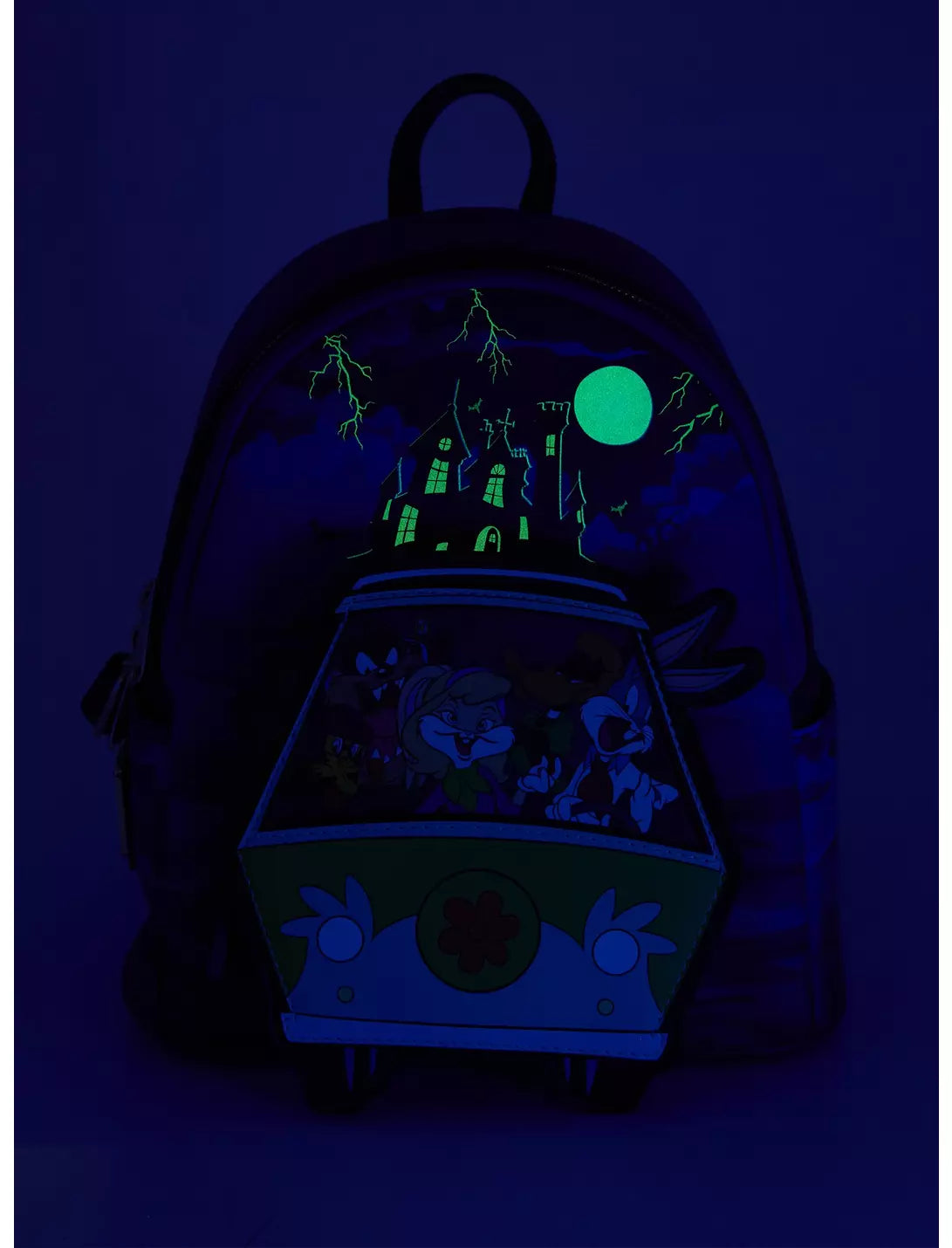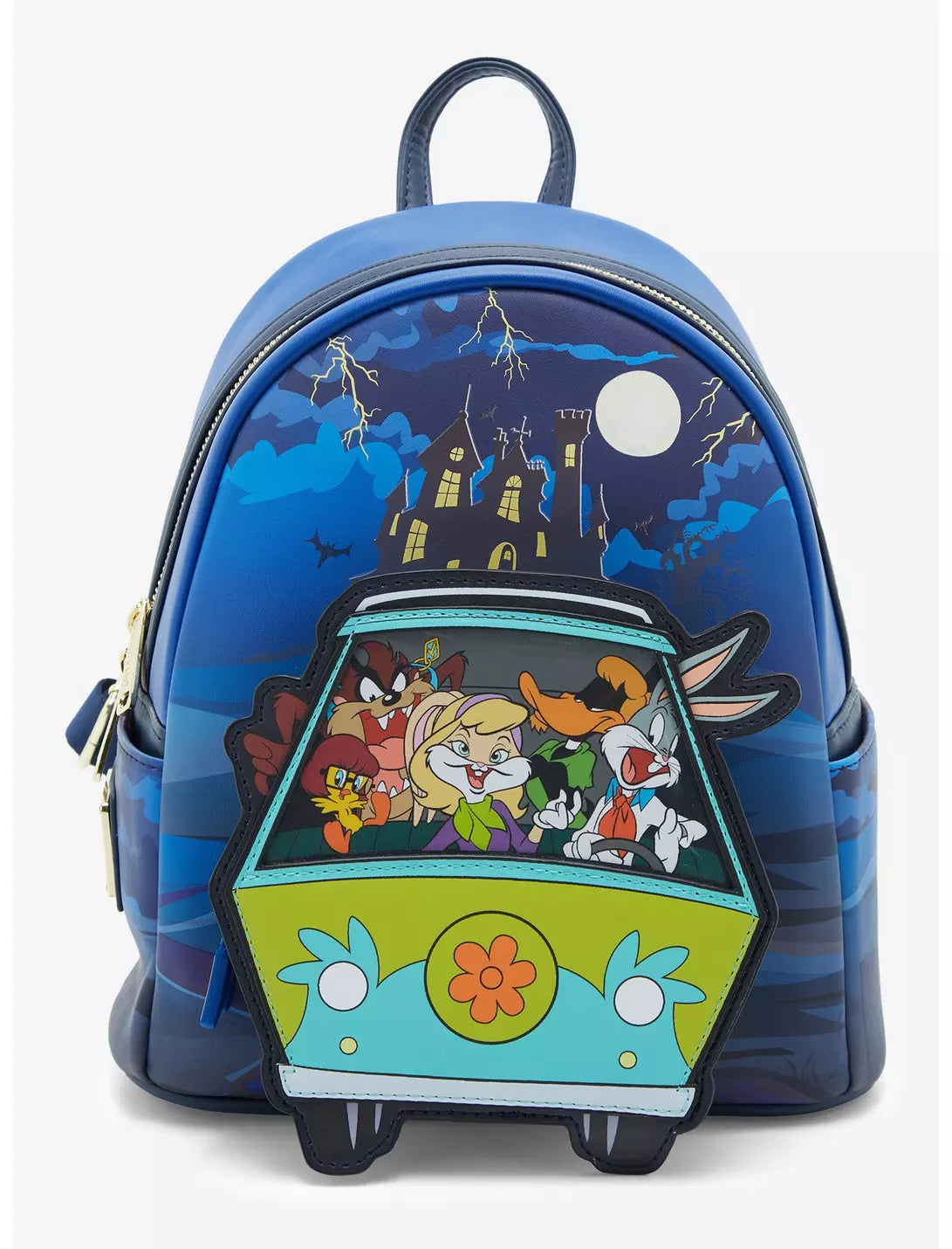 Your favorite cartoon characters have joined Mystery Inc. as this Loungefly mini backpack! The front features an applique of Looney Tunes characters like Bugs Bunny, Lola Bunny, and Tweety Bird dressed up as Scooby-Doo characters like Fred, Daphne, and Velma in the Mystery Machine. Comes with a glow-in-the-dark castle on the front and eyes on the straps. Complete with side pockets, a "Zoinks" front zipper pocket charm.