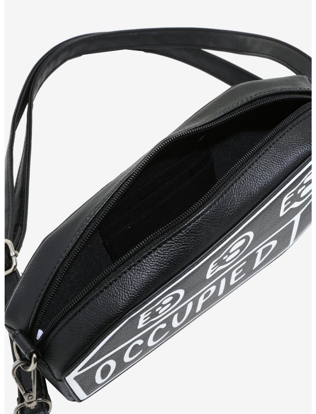 Sorry, this coffin is occupied by lipstick, cash and a fatal attraction to the dead. This coffin-shaped crossbody bag features "Occupied" text design with three skulls. Zipper closure, 3 card slots and detachable, adjustable strap.