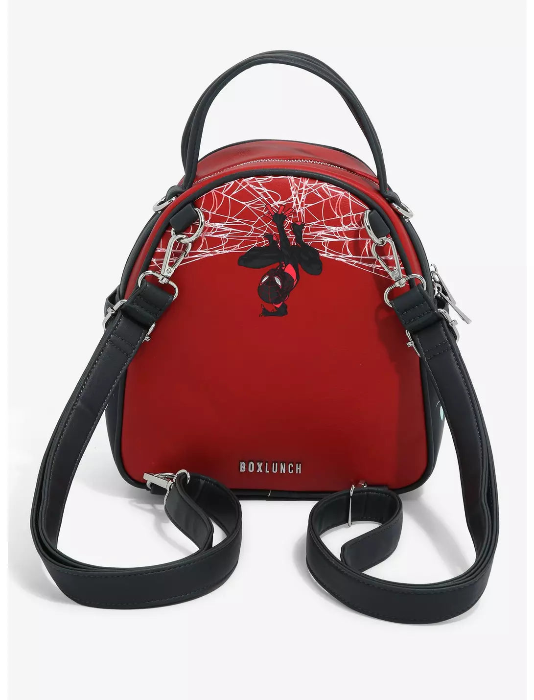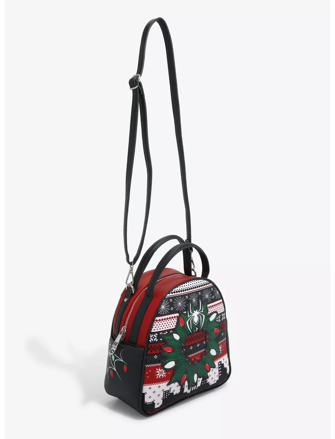 Celebrate the holidays in Spidey style with this Spider-Man-inspired mini backpack! Adorned with a spider logo-themed wreath, a holiday-themed New York skyline background on the front, and a web-slinging Miles Morales on the back, this backpack features side pockets, removable adjustable shoulder straps, cross-body strap, and a zipper compartment. Stay stylish like the Spider-powered hero and this mini backpack.